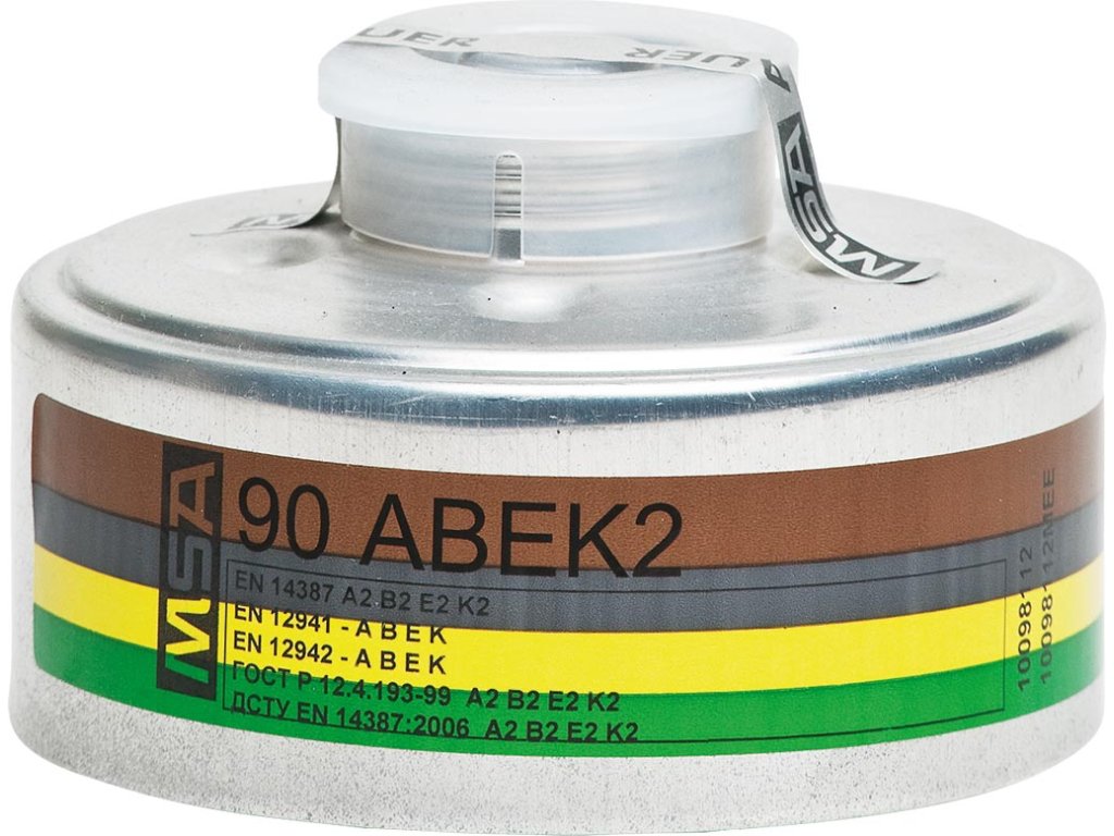 90 Náhradný filter ABEK 2 pre polomasky a celotvárové masky so závitovým pripojením. - Typ A2B2E2K2 - Použitie: organické plyny a pary s bodom varu nad 65°C; anorganické plyny a pary, napr. chlór, sírovodík, kyselina kyanovodíková; oxid siričitý, kyselina chlorovodíková, kyslé plyny; amoniak a deriváty - Spĺňa požiadavky normy EN14387Dodatočné parametre