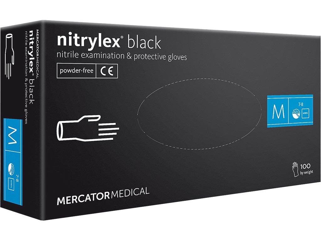 Čierne nitrilové rukavice MARCATOR MEDICAL - bez púdru, Nitrylex® - Vhodné pre pravú aj ľavú ruku - Ideálne pre zložité manipulácie - Mikrotextúrovaný vonkajší povrch s textúrovanými končekmi prstov - Polymerizované a chlórované na vnútornej strane - Vhodné na použitie v lekárskom, zubnom, veterinárnom, kozmetickom a kaderníckom prostredí - Bezpečné pre potraviny - Zdravotnícka pomôcka triedy I a osobné ochranné prostriedky kategórie III - Balené po 100 kusoch v krabici - Spĺňa normy EN420 a EN455