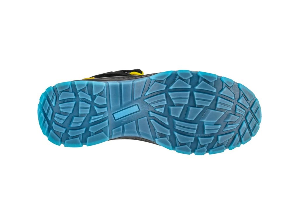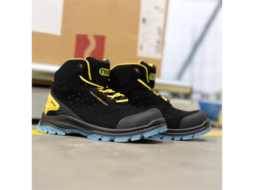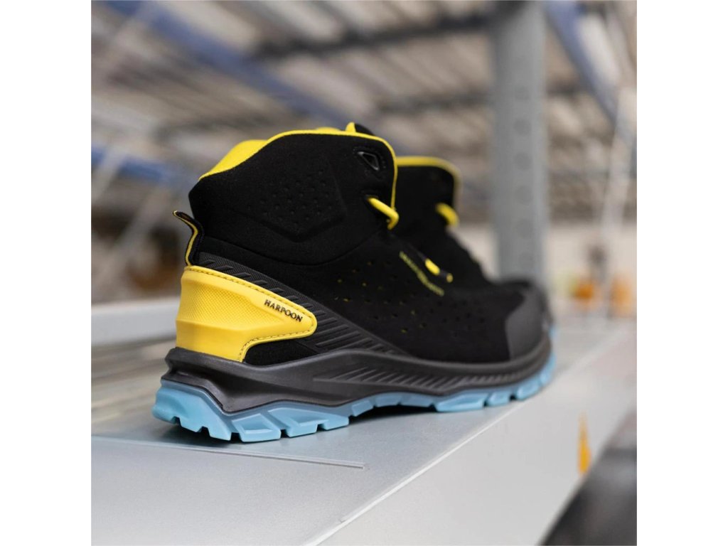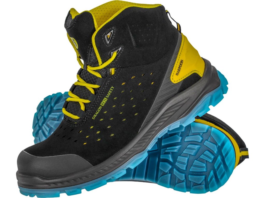 Členková pracovná obuv S1PS HORPOON REIS. - vyrobená zo semišovej kože v kombinácii s TPU - členkové topánky, ktoré zakrývajú členok - šnurovanie - protišmyková, olejuvzdorná a antistatická podrážka vyrobená z polyuretánu s dvojitou hustotou - tlmenie nárazov pod pätou - nekovová kompozitná vložka chráni chodidlo pred prepichnutím tlakom 1100 N - kompozitná špička odolná voči nárazom 200 J a tlakovým silám až 15 kN - pogumovaný povlak zabraňuje oderu - bez kovových povrchových úprav - BEZ KOVOV - kategória S1PS SR FO