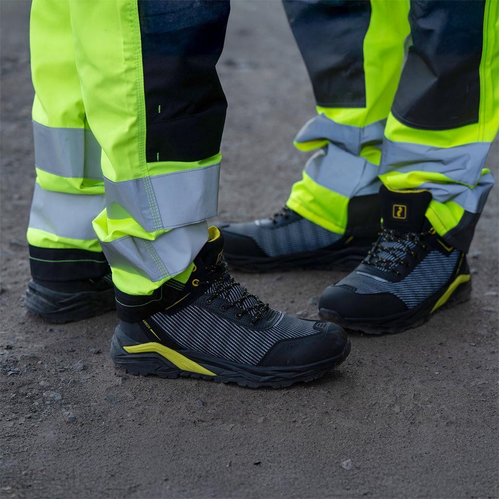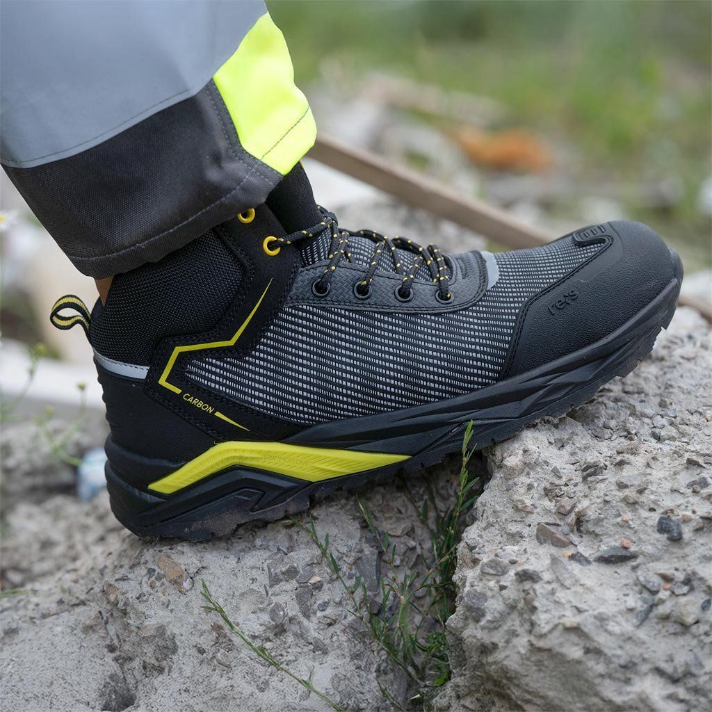 Pánska členková pracovná obuv S3S CARBON REIS. - Vyrobená z polyesterovej tkaniny v kombinácii so semišovou syntetickou kožou (mikrovlákno) a TPU vložkami - Členkové čižmy - Šnurovanie - Protišmyková, olejuvzdorná, antistatická podrážka z EVA a gumy - Tlmenie nárazov pod pätou - Nekovová kompozitná vložka chráni chodidlo pred prepichnutím tlakom 1100 N - Kompozitná špička odolná voči nárazom 200 J a tlakovým silám až 15 kN - Gumový povlak zabraňuje oderu - Bez kovových povrchových úprav - BEZ KOVOV - Reflexné prvky - Kategória S3S FO SR