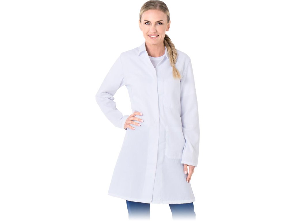 Dámska ochranná zástera. - Materiál: 65% polyester, 35% bavlna - Hmotnosť: 255 g/m² - Zapínanie na patentky - S golierom - Dve vnútorné vrecká na ľavej strane - jedno hore a jedno dole - Vhodné pre HACCP (potravinársky priemysel) - Vhodné na priemyselné pranie (maximálna teplota 95°C)Dodatočné parametre