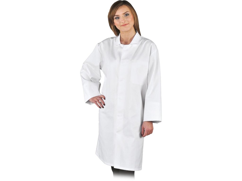 Dámska ochranná zástera. - Materiál: 65% polyester, 35% bavlna - Gramáž: 200 g/m² - Zapínanie na patentky - S golierom - Dve vnútorné vrecká na ľavej strane - jedno hore a jedno dole - Vhodné pre HACCP (potravinársky priemysel) - Vhodné na priemyselné pranie (maximálna teplota 95°C)Dodatočné parametre