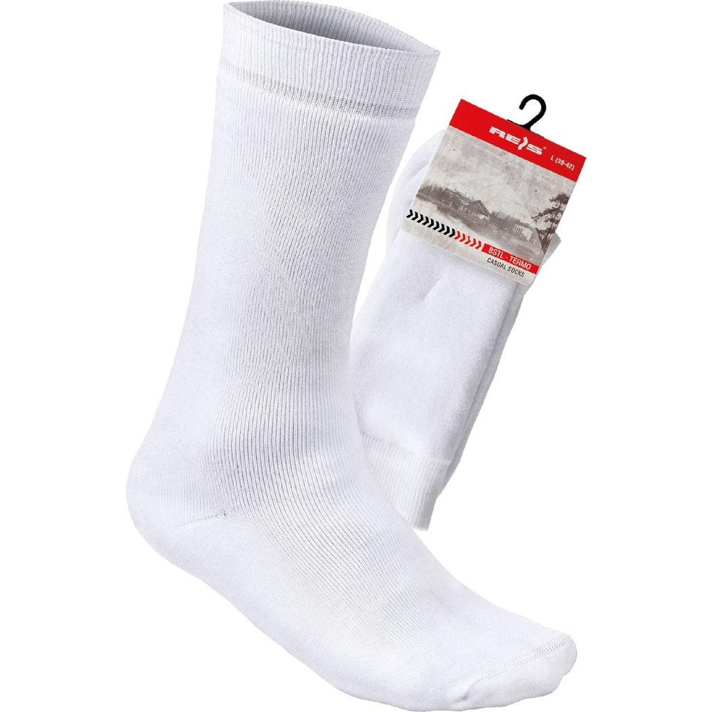 Dlhé biele termo ponožky REIS. - Froté - 2/3 dĺžky lýtka - Určené na dlhodobé nosenie pri nízkych teplotách - Poskytujú pohodlie - Chránia chodidlá pred oderom - Hypoalergénne - Dodávajú sa s malým vešiakom pre jednoduché vystavenie