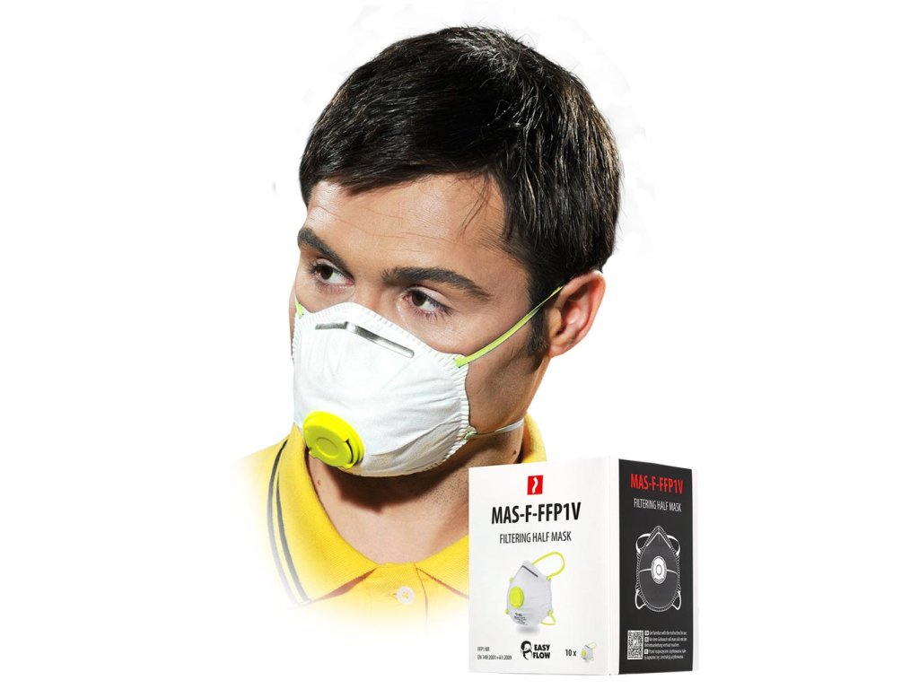 Respirátor proti prachu s ventilom.- Typ FFP1: ochrana pred netoxickými kvapalnými alebo pevnými aerosólmi (napr. olejová hmla) v koncentráciách 4,5xOEL alebo 4xAPF (OEL)