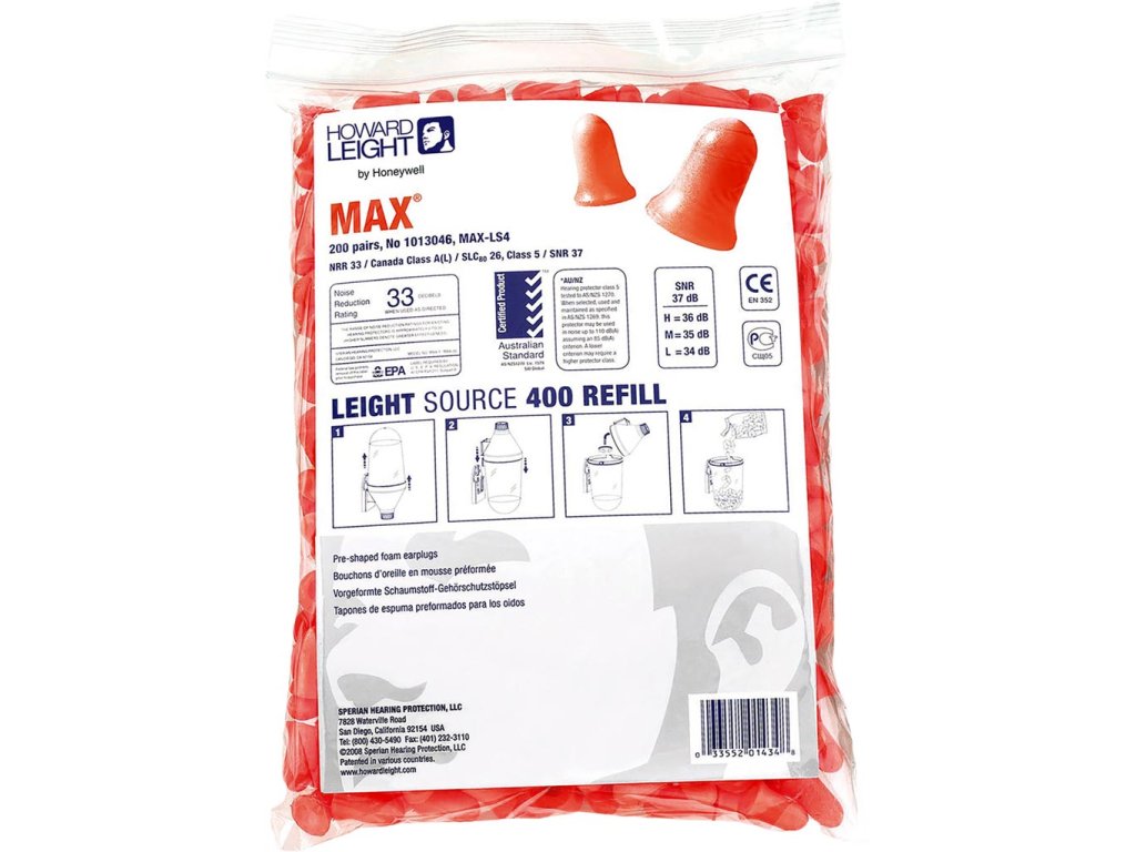 štuple do uší MAX. - Úroveň útlmu hluku: SNR=37 dB - Nízkotlaková polyuretánová pena jemne expanduje vo vnútri zvukovodu, prispôsobí sa takmer každému nositeľovi a zaisťuje dlhotrvajúci komfort. - Po vložení sa prispôsobí zvukovodu bez zbytočného tlaku. - Hladký povrch odolný voči nečistotám. - 400 kusov v balení. - Vyhovuje norme EN352-2.Dodatočné parametre
