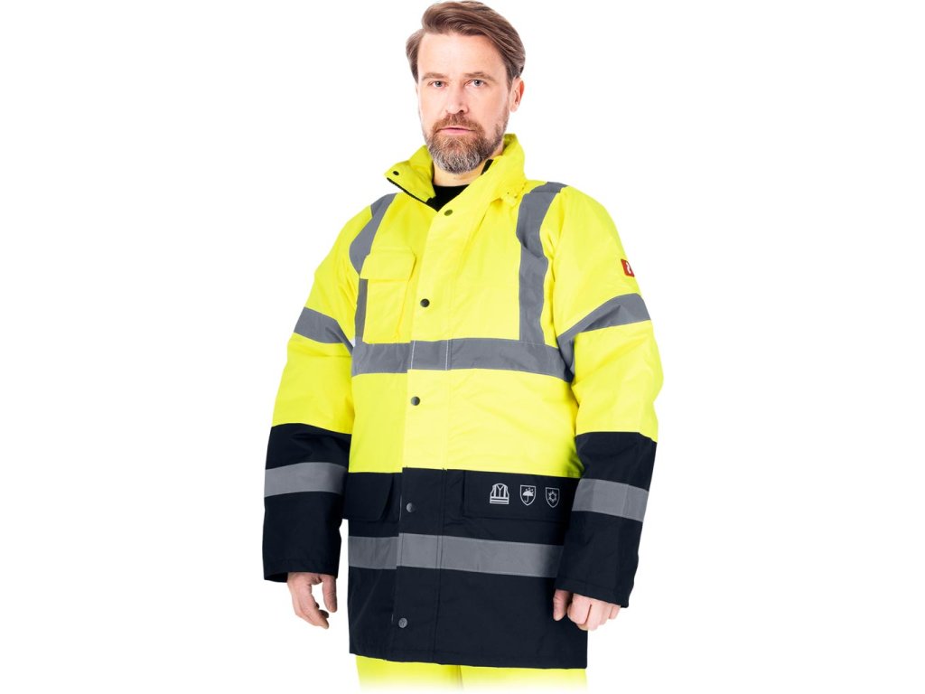 Pánska zateplená ochranná bunda. - Látka: 100% 300D polyester Oxford s PU záterom, 190 g/m² - Výplň: 100% polyester, 160 g/m² - Prešívaná podšívka: 100% polyester Taffeta, 55 g/m² - Obojsmerný zips s dodatočným zapínaním na patentky - Stojací golier - Kapucňa so sťahovacími šnúrkami, ktoré sa dajú zrolovať do goliera a zaistiť suchým zipsom - Dve spodné vrecká a vrecko na mobil na hrudi - Skryté vrecko na zips pod chlopňou - Vnútorné vrecko na suchý zips - Rukávy s elastickými manžetami - Fluorescenčná tkanina a reflexné pruhy pre zvýšenú viditeľnosť - Ideálne pre cestných pracovníkov a iných pracovníkov činných v trestnom konaní - štýl: RELAXOVANÝDodatočné parametre
