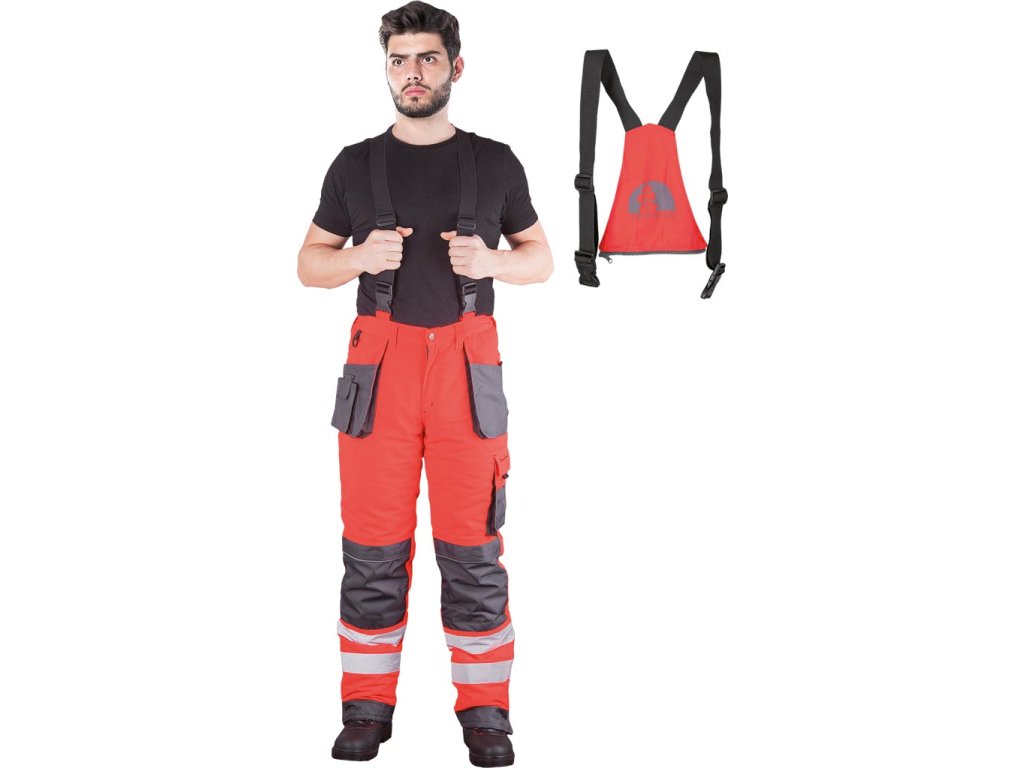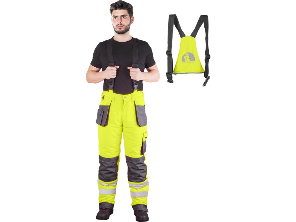 FORMEN 2 v 1 zateplené ochranné montérky, pánske. - Hlavný materiál: 80 % polyester, 20 % bavlnené plátno (farby CSB: 100 % polyester) s hmotnosťou 270 g/m² - Vložky: 100% polyester 600D Oxford tkanina s hmotnosťou 240 g/m² a 100% polyester 300D Oxford tkanina prvky s hmotnosťou 175 g/m² - Výplň: 100% polyester s gramážou 130 g/m² - Prešívaná podšívka: 100% polyester 190T taft s hmotnosťou 50 g/m² - Zapínanie na gombík a zips - Dve dvojité bočné vrecká, jedno na mobilný telefón a dve zadné vrecká so zapínaním na suchý zips - Vrecká na nohách, vrátane jedného zapínania na suchý zips s priehradkami na príslušenstvo a jedného pozdĺžneho vrecka - vrecká na vložky Top-entry chrániče kolien so zapínaním na suchý zips - Predtvarované kolená - Nohy so zapínaním na zips pre nastavenie šírky - Prispôsobenie dĺžky odnímateľnými trakmi a gumou vzadu - Elastický pás na bokoch pre lepšie prispôsobenie - Klip na kľúče - Slučka na kladivo na pravej nohe - Fluorescenčná tkanina a reflexné pruhy pre zvýšenú viditeľnosť - Ideálne pre cestné posádky a iný personál činný v trestnom konaní - Testované na škodlivé látky v súlade s OEKO-TEX® Standard 100Dodatočné parametre