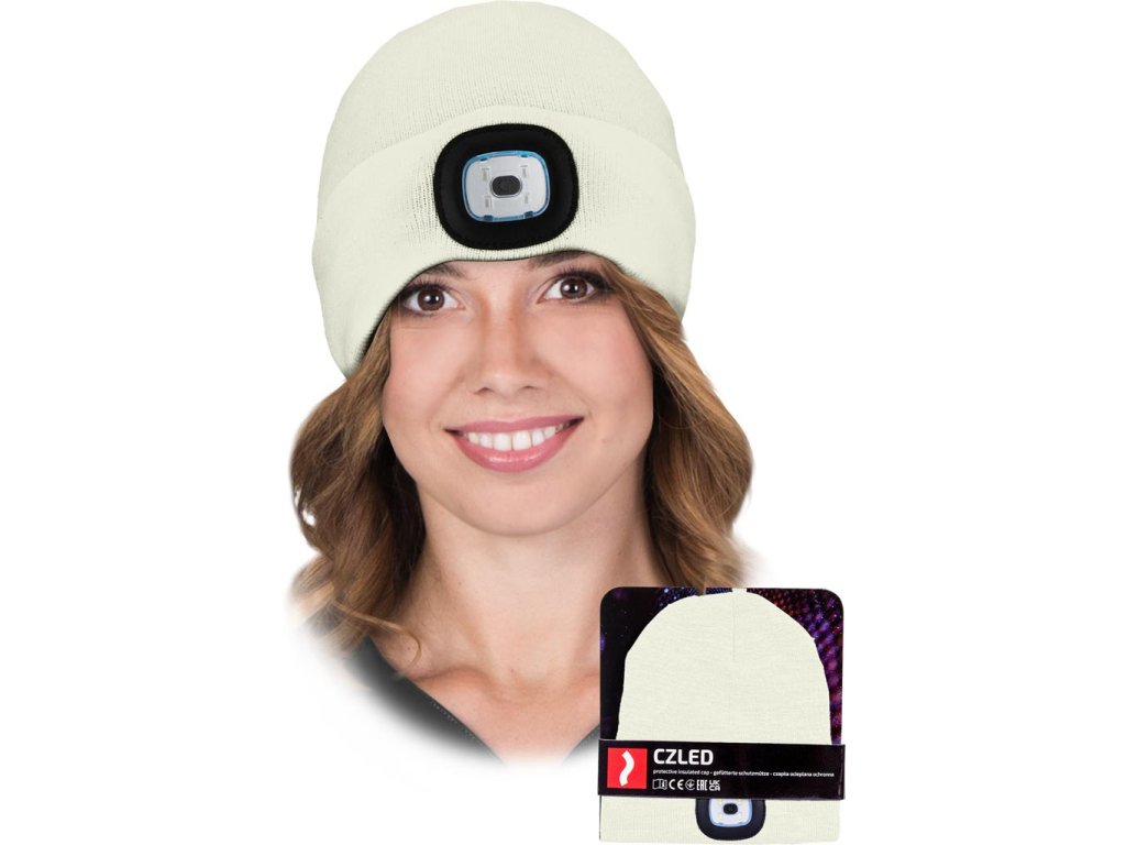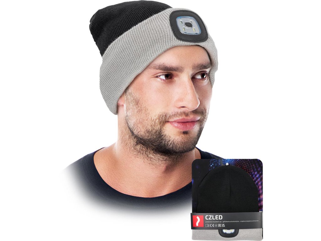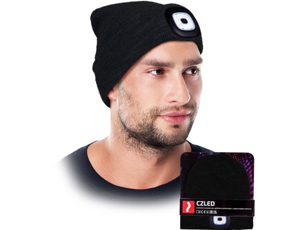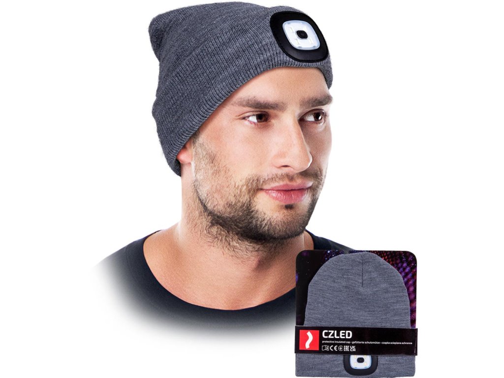 LED zimná čiapka s vymeniteľnou baterkou. - Úplet: 100% akrylová priadza, 200 g/m²- Zateplené 100% polyesterovým rúnom, 110 g/m²