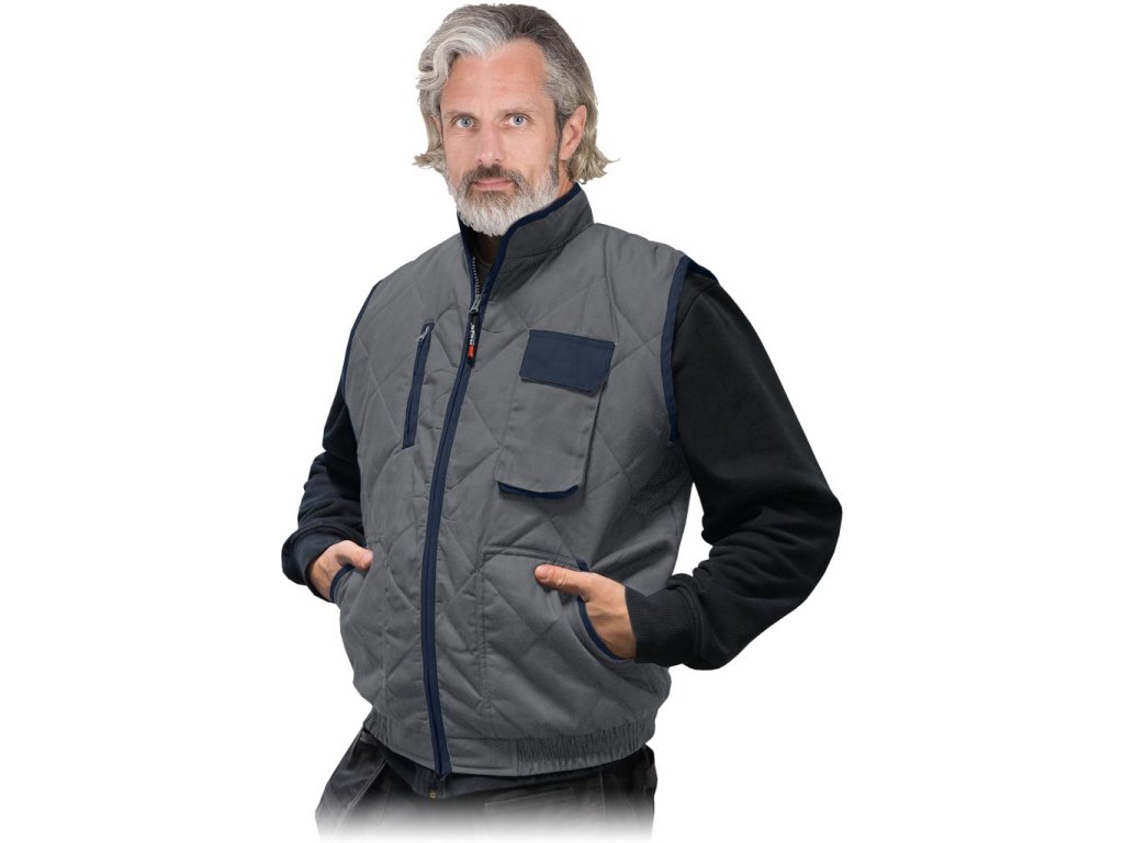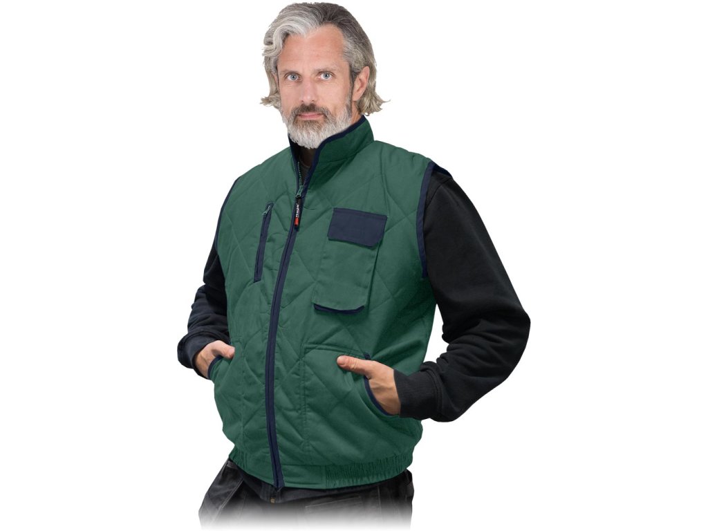 Pánska prešívaná, zateplená ochranná vesta. - Materiál: 65% polyester, 35% bavlna, 150 g/m² - Výplň: 100% polyester, 160-180 g/m² - Podšívka: 100% polyester, 60 g/m² - Zapínanie na zips - Stojací golier - Dve spodné vrecká a jedno náprsné vrecko na mobilný telefón - Rebrované manžety v spodnej častiDodatočné parametre