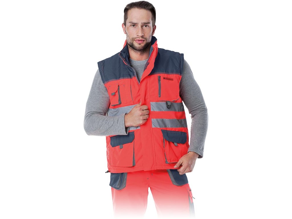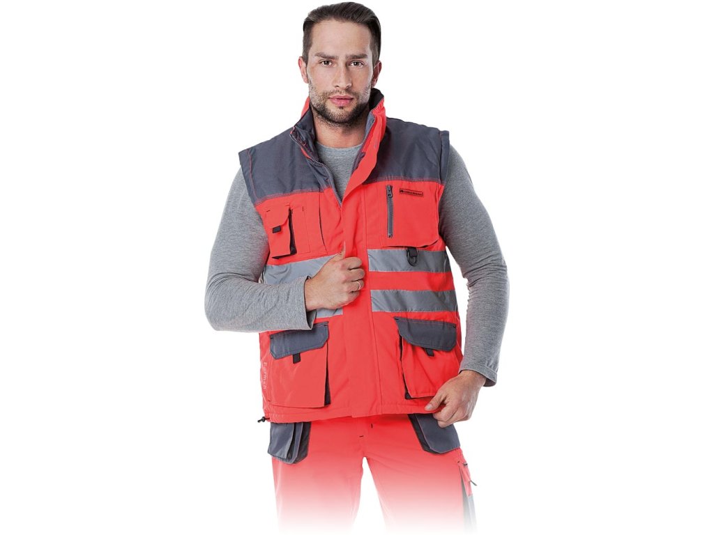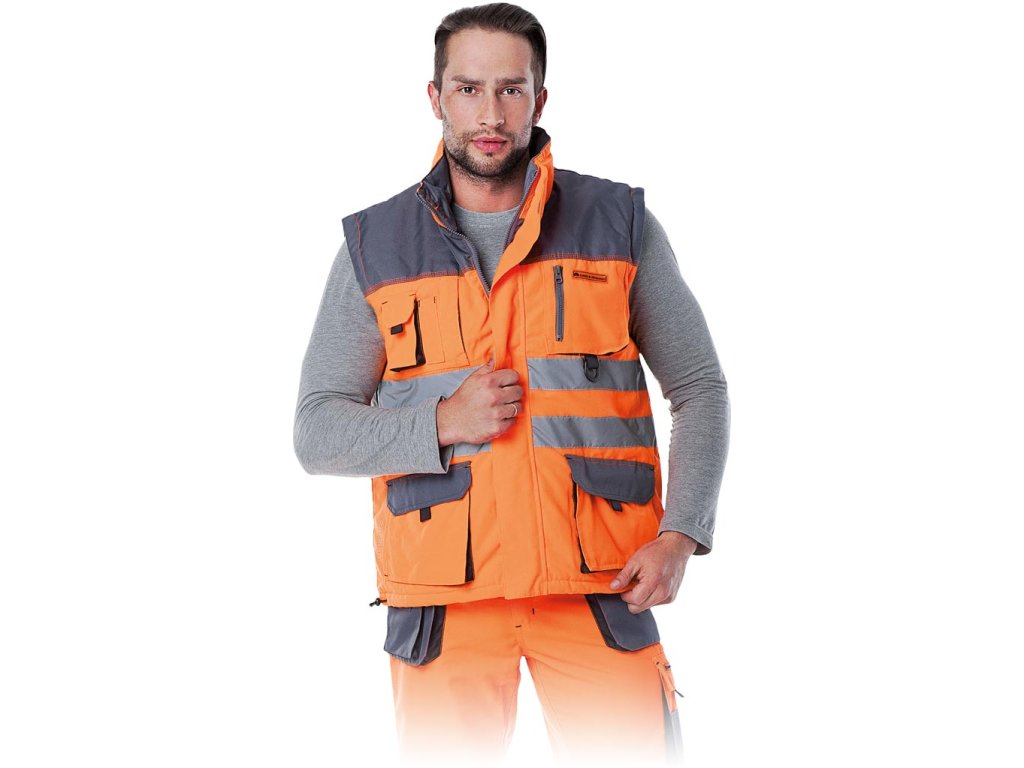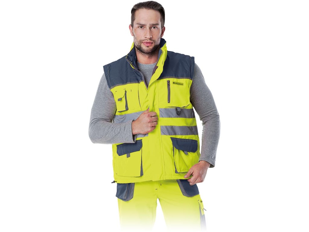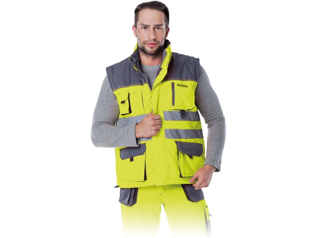 Zateplená ochranná vesta bez rukávov FORMEN, pánska. - Látka: 80 % polyester, 20 % bavlna (farby CSB a CGS: 100 % polyester) s hmotnosťou 270 g/m² - Výplň: 100% polyester s gramážou 130 g/m² - Podšívka: 100% polyester taft 190T s hmotnosťou 50 g/m² - Zapínanie na zips s dodatočnými suchými zipsami - Tri náprsné vrecká, z toho dve na zips a jedno na telefón, jedno úzke vrecko na príslušenstvo, napr. pero, a dve spodné vrecká - Klip na kľúče - Slučky na pripevnenie ďalšieho príslušenstva - Šedá látková výstuž na ramenách vesty zvyšuje jej odolnosť proti oderu - Starostlivé spracovanie a zvýšená odolnosť zaisťujú vysoký komfort - Testované na obsah škodlivých látok v súlade s OEKO-TEX® Standard 100 - Materiál a popruh testovaný v súlade s EN ISO 20471Dodatočné parametre