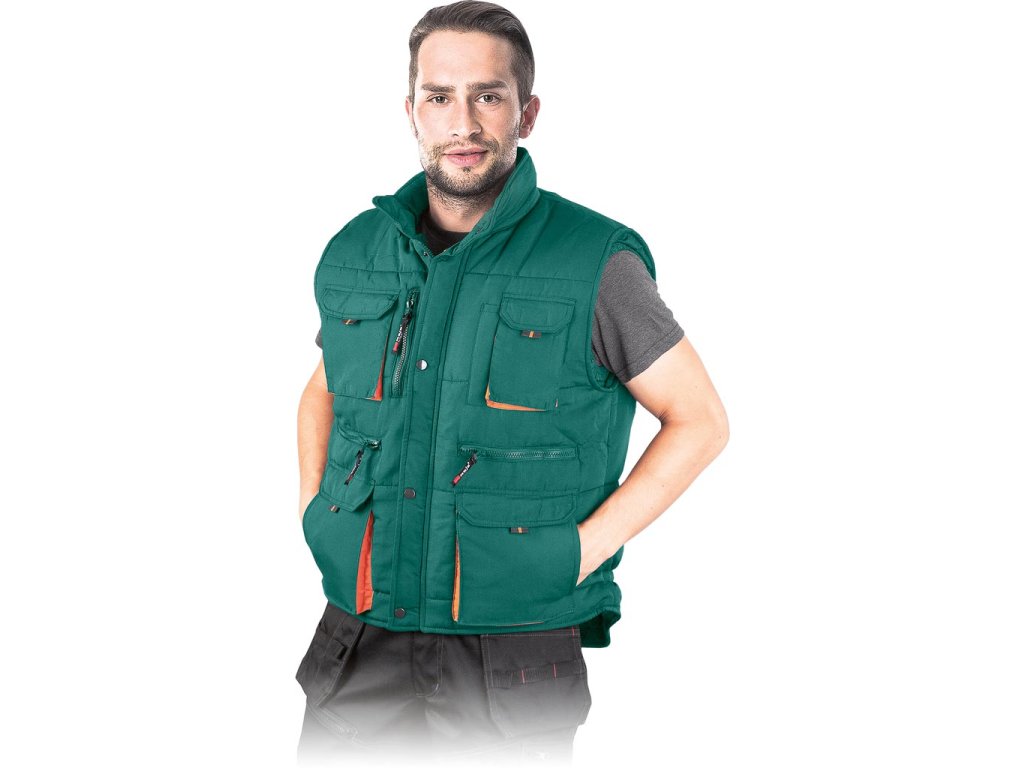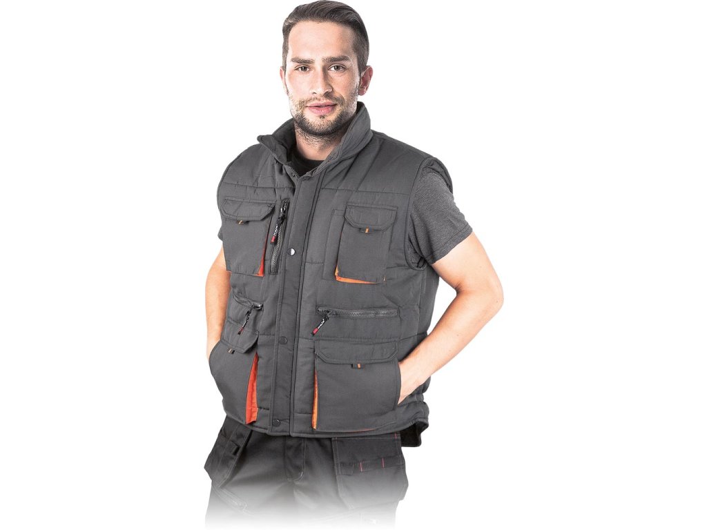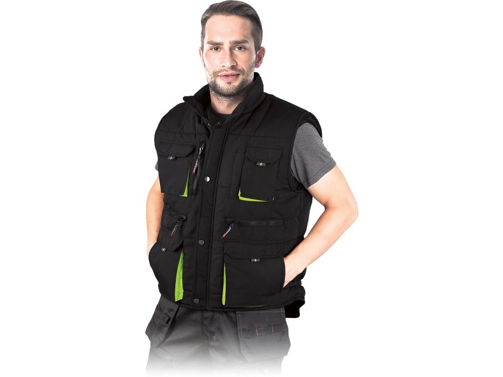 Pánska zateplená ochranná vesta. - Materiál: 100% polyester, 95 g/m² - Výplň: 100% polyester, 220 g/m² - Podšívka: 100% polyester, 60 g/m² - Zapínanie na zips s dodatočným zaklapnutím - Stojací golier - Štyri spodné vrecká a tri náprsné vrecká, vrátane jedného na mobilný telefón a ďalšej priehradky, napr. na pero - Vnútorné vrecko so zapínaním na suchý zips - Rukávy s elastickými manžetami, ktoré zabraňujú vniknutiu vetra - Predĺžený zadný lem - Viaceré vrecká na uloženie rybárskeho príslušenstva, montážneho náradia a potrieb pre domácich majstrovDodatočné parametre