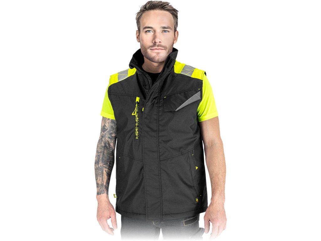Pánska zateplená ochranná vesta bez rukávov. - Rip-stop tkanina: 100% polyester Oxford potiahnutý polyuretánom, 210 g/m² - Výplň: 100% polyester, 120 g/m² - Prešívaná podšívka: 100% polyester taft, 60 g/m² - Rip-stop tkanina chráni pred roztrhnutím pri zachytení o vyčnievajúci predmet - Zapínanie na zips s dodatočným suchým zipsom - Stojací golier - Dve spodné vrecká na zips a dve náprsné vrecká, jedno na zips a druhé na suchý zips - Vnútorné vrecko so zapínaním na suchý zips - Lem vesty možno zvnútra stiahnuť šnúrkami - Reflexné prvky pre zvýšenú viditeľnosť - Fit: REGULARDodatočné parametre