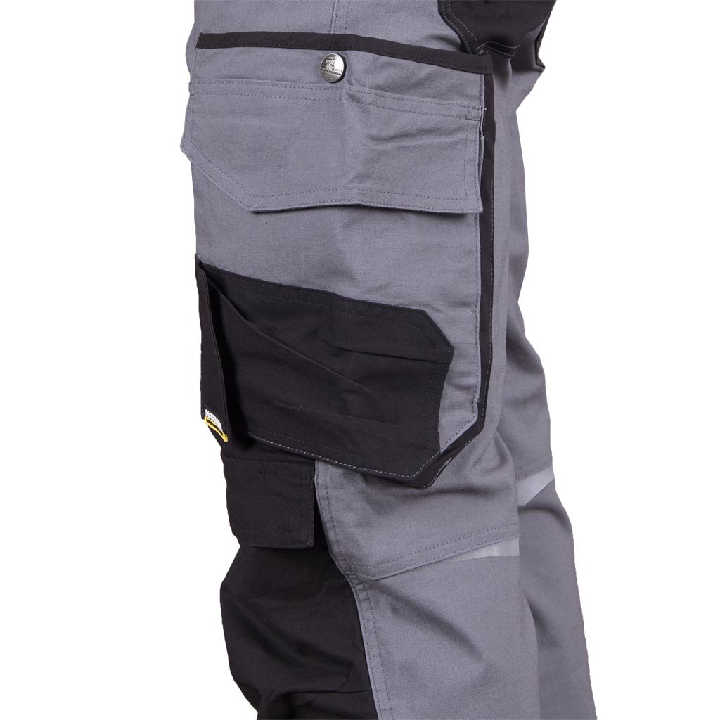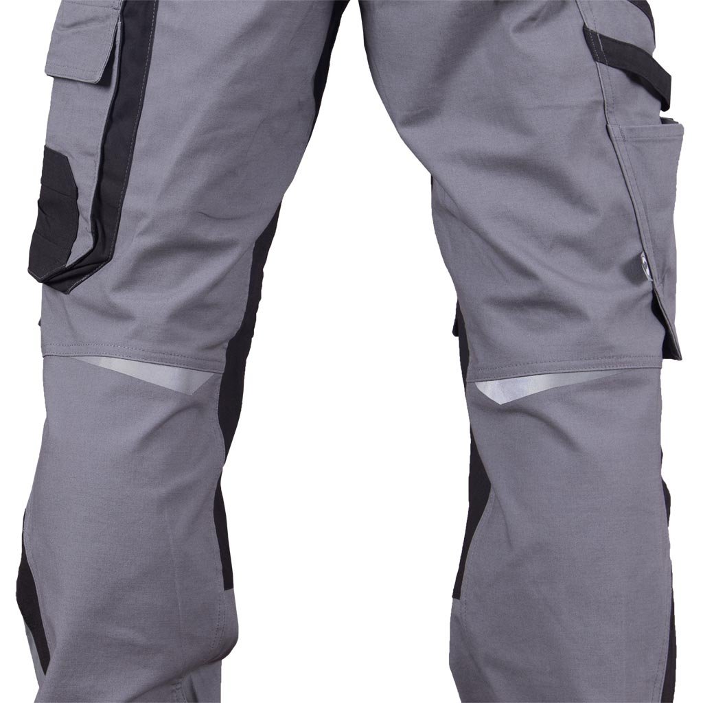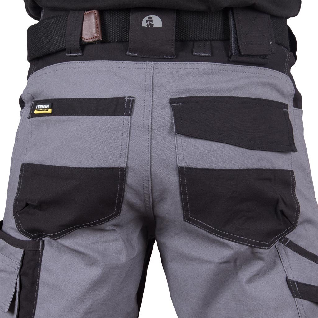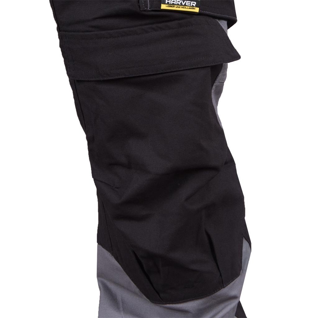 Kapsáčové pánske pracovné nohavice do pása HARVERAIR L.HOLLMAN. - materiál: 97 % bavlna, 3 % elastan - gramáž 240 g/m² - zapínanie na gombík a zips - dve bočné vrecká - dve zadné vrecká, z ktorých jedno je so zapínaním na suchý zips - vrecká na nohaviciach vrátane vrecka na mobilný telefón - vrecká na kolenách na chrániče kolien so zapínaním na suchý zips - reflexné prvky - tvar "S" - predtvarované nohavice pre lepšie prispôsobenie - testované na prítomnosť škodlivých látok v súlade s normou OEKO-TEX® 100