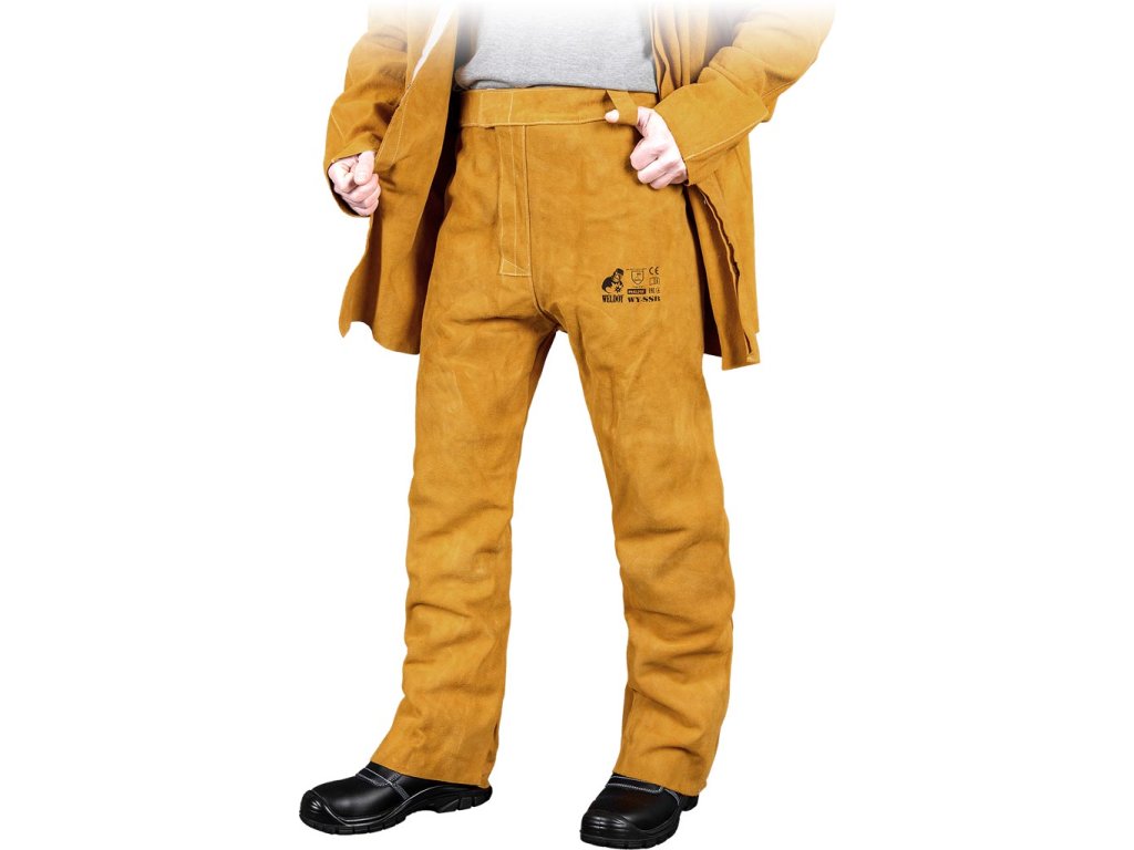 Kožené zváračské nohavice. - Štiepaná hovädzia koža - Šité kevlarovou niťou spomaľujúcou horenie a teplu - Rozmery: cca. šírka 106 cm, cca. 105 cm dlhé - Zapínanie na suchý zips - Štyri pútka na opasok v páse - Vyhovuje normám EN11611 (A1) a EN13688Dodatočné parametre