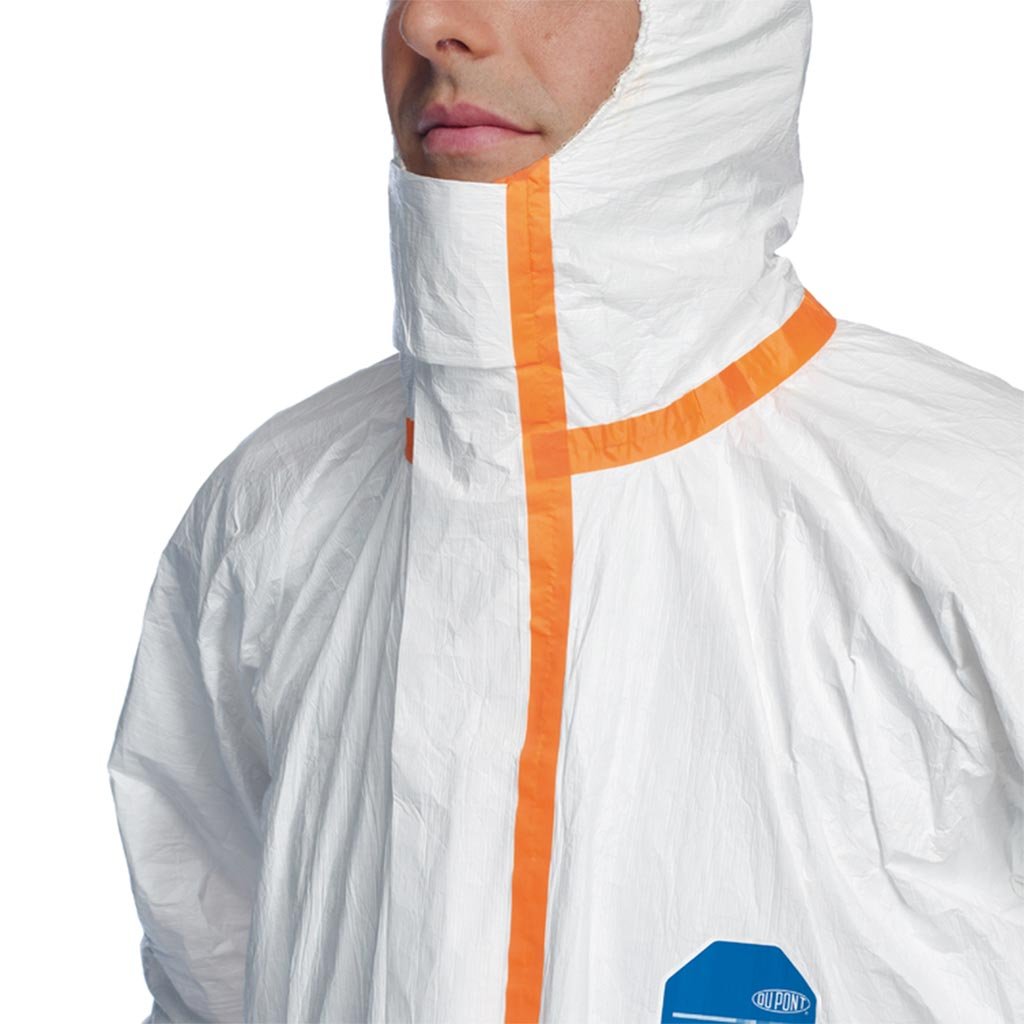 Ľahký ochranný ovral TYVEK® 800 J DUPONT vyrobený z netkanej textílie TYVEK®. - ochranná bariéra zodpovedajúca ochrannému odevu kategórie III, typ 3b, 4b, 5b a 6b - vďaka použitiu technológie nepriepustného materiálu je odolný voči tlakovým chemickým prúdom na vodnej báze a zároveň je priedušný a zaisťuje voľný pohyb - poskytuje tiež ochranu pred malými, nebezpečnými pevnými časticami a olejom, biologickými hrozbami a pred kontamináciou rádioaktívnymi časticami - zips TYVEK® prekrytý samolepiacou chlopňou zaisťuje optimálnu ochranu - elastická kapucňa, ktorá sa dokonale prispôsobí pohybom hlavy a maske na tvár - chlopňa na brade zvyšuje ochranu pred kvapalinami a hodí sa na celotvárovú masku - oranžová páska zaisťujúca švy poskytuje dodatočnú ochranu a zvyšuje viditeľnosť používateľa - elastické manžety na rukávoch a nohaviciach a elastický pás v páse zabezpečujú optimálne prispôsobenie odevu telu - má antistatické vlastnosti - vhodný na čistenie priemyselných zariadení, petrochemických zariadení a závodov, vodovodných a kanalizačných systémov a údržbárskych prác - používa sa pri odstraňovaní azbestu - spĺňa požiadavky noriem EN14605, EN13982-1, EN13034, EN1149-5, Normy EN1073-2 a EN14126