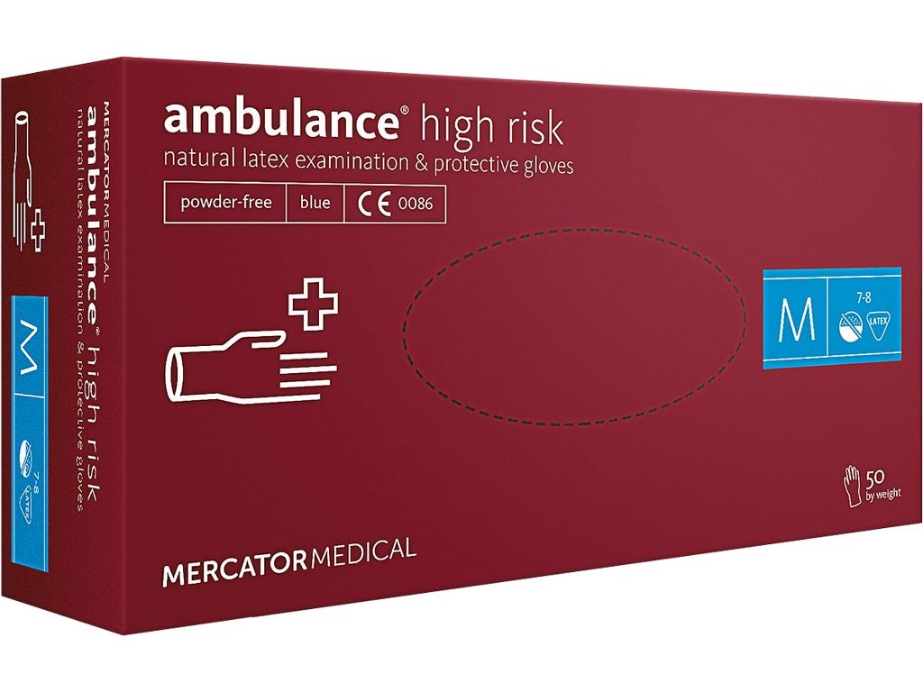 Latexové diagnostické rukavice - bez prášku, sanitka® s vysokým rizikom. - 100% latex - Vhodné pre pravú aj ľavú ruku - Ideálne pre komplexnú manipuláciu - Textúrovaný vonkajší povrch - Majú zosilnenú, hrubšiu ochrannú stenu a predĺženú manžetu, čím poskytujú lepšiu ochranu pred infekciou - Vhodné pre diagnostiku a prácu záchranárov, ako aj ošetrovateľskú starostlivosť - Používajú sa aj v lekárskych vyšetreniach, biochemických a analytických laboratóriách, endoskopických miestnostiach a centrálnych sterilizačných zariadeniach - Odporúčame ich použitie aj všade tam, kde môže dôjsť k nekontrolovanému šíreniu infekčného materiálu - Schválené pre styk s potravinami - Sú to zdravotnícke pomôcky triedy I a osobné ochranné prostriedky kategórie III - Balené po 50 kusov v krabici - Vyhovuje normám EN455, EN ISO 15223-1, EN1041 a EN420 EN374-1 EN374-2, EN374-3Dodatočné parametre