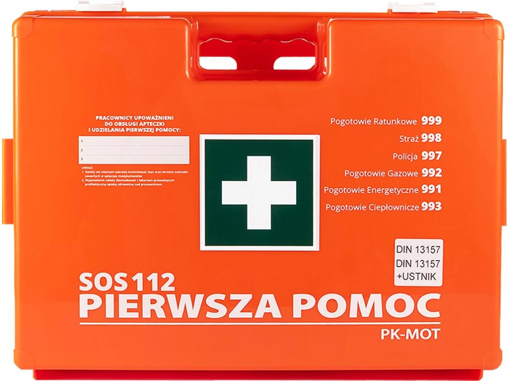 Prenosná súprava prvej pomoci na použitie na mieste. - vyrobené z plastu (ABS) - Zariadenie v súlade s DIN 13164 a DIN 13157:2009 - Sada náplastí s obväzom: 6x10 cm (12 ks), 4,3x7,2 cm (2 ks), 12x2 cm (2 ks), 1,9x7,2 cm (2 ks), 2,5x7,2 cm (4 ks) - sadrový kotúč 5 m x 2,5 cm (2 ks) - Sada náplastí, 4 druhy - stlačený obväz 6x8 cm (1 ks) - Elastický obväz 4 m x 6 cm (4 ks) - Elastický obväz 4 m x 8 cm (5 ks) - vinylové rukavice (4 páry) - vlhčené obrúsky (2 ks) - obväz 60x80 cm (2 ks) - obväz 60x40 cm (1 ks) - netkaná textília 20x30 cm (5 ks) - obväz 6x8 cm s obkladom (individuálny obväz) (1 ks) - 8x10 cm obväz s obkladom (individuálny obväz) (5 ks) - 10x12 cm obväz s obkladom (individuálny obväz) (2 ks) - obklad na rany 10x10 cm (12 ks.) - 5x7,5 cm obklad na oči (2 ks.) - studený obklad (1 ks) - 96x96x136 cm trojuholníkové plátno (4 ks.) - termo deka 160x210 cm (2 ks) - 14,5 cm a 19,5 cm nožnice (2 ks) - plastové vrecko (2 ks) - dýchacie prístroje na umelé rany - Pokyny pre núdzovú prvú pomoc a zoznam vybavenia - S vešiakom na stenu - Určené pre pracoviská - Rozmery lekárničky: 41x30x15Dodatočné parametre