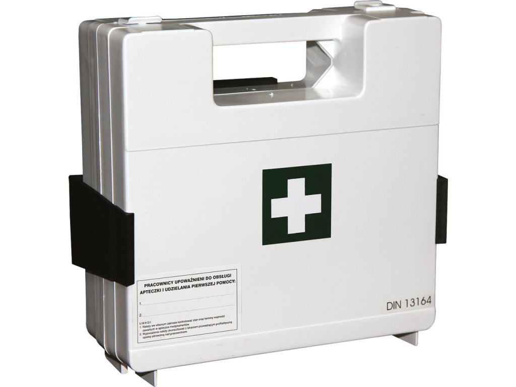 Lekárnička s rukoväťou na použitie na pracovisku. - vyrobené z plastu (polystyrén) - Zariadenie v súlade s DIN 13164:2022 - 5m x 2,5cm omietka na cievke – 1 ks. - Sada náplastí – 14 ks. (6 x 10 cm (4 ks), 4,3 x 7,2 cm (2 ks), 12 x 2 cm (2 ks), 1,9 x 7,2 cm (2 ks), 2,5 x 7,2 cm (4 ks)) - Elastická bandáž 4m x 6cm – 2 ks. - Elastická bandáž 4m x 8cm – 3 ks. - Jednorazové vinylové rukavice – 4 ks/2 páry - Bandáž 60 x 80cm – 1 ks. - Obväz s obkladom (individuálny obväz) 6 x 8 cm – 1 ks. - Obväz s obkladom (individuálny obväz) 8 x 10 cm – 2 ks. - Obväz s obkladom (individuálny obväz) 10 x 12 cm – 1 ks. - Obklad na ranu 10 x 10 cm – 6 ks/3 bal. - Trojuholníkový obväz 96 x 96 x 136 cm – 1 ks. - Termálna deka – 1 ks. - Lekárska maska - 2 ks. - nožnice - 1 ks. - vlhčené obrúsky - 2 ks. - Návod na prvú pomoc – 1 ks. - respirátor (1 ks) - Puzdro na montáž na stenu - Rozmery lekárničky: 10,5 x 24 x 24 cmDodatočné parametre