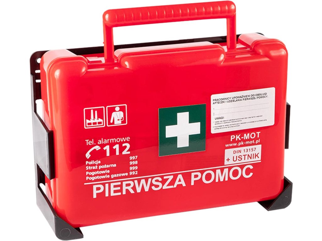 Súprava prvej pomoci, vlastnená spoločnosťou. - vyrobené z plastu (polystyrén) - Zariadenie v súlade s normou DIN 13157:2022 - 5m x 2,5cm omietka na cievke (1 ks) - Sada náplastí (5 druhov) (42 ks/1 bal.) - Bandáž s obkladom (individuálny obväz) 6x8 cm (1 ks) - Bandáž s obkladom (individuálny obväz) 8x10 cm (3 ks) - Bandáž s obkladom (individuálny obväz) 10x12 cm (1 ks) - Obväzová látka 60x80 cm (1 ks) - Obklad na ranu 10x10 cm (6 ks/3 bal.) - Kompresia na oči 5x7,5 cm (2 ks) - studený obklad (1 ks) - Pohotovostná deka (210x160 cm) (1 ks) - Elastický obväz 4m x 6cm (2 ks.) - Elastický obväz 4m x 8cm (2 ks.) - Rozmery trojuholníkového obväzu: 96x96x136 cm (2 ks) - nožnice (1 ks) - plastové vrecko (2 ks) - Bandáž z netkanej textílie 20x30 cm (5 ks/1 balenie) - vlhčené obrúsky (4 ks.) - Jednorazové rukavice (4 ks/2 páry) - lekárska maska (2 ks) - Pokyny "Prvá pomoc" (1 ks) - respirátor (1 ks) - S vešiakom na stenu - Určené pre malé pracoviská - Rozmery lekárničky: 26x17x8 cmDodatočné parametre