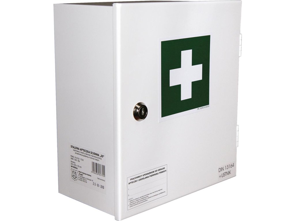 Nástenná lekárnička. - Vyrobené z oceľového plechu s vypáleným bielym práškovým nástrekom - Zariadenie vyhovuje norme DIN 13164:2022 - 5m x 2,5cm omietka na cievke – 1 ks. - Sada náplastí – 14 ks. (6 x 10 cm (4 ks), 4,3 x 7,2 cm (2 ks), 12 x 2 cm (2 ks), 1,9 x 7,2 cm (2 ks), 2,5 x 7,2 cm (4 ks)) - elastický obväz 4m x 6cm – 2 ks. - elastický obväz 4m x 8cm – 3 ks. - 4x2 páry jednorazových vinylových rukavíc - obväz 60x80 cm – 1 ks. - Obväz s obkladom (individuálny obväz) 6x8 cm – 1 ks. - Obväz s obkladom (individuálny obväz) 8x10 cm – 2 ks. - Obväz s obkladom (individuálny obväz) 10x12 cm – 1 ks. - Obklad na ranu 10x10cm – 6 ks/3 bal. - Rozmery trojuholníkového obväzu: 96x96x136 cm – 1 ks. - Termálna deka – 1 ks. - Lekárska maska - 2 ks. - nožnice - 1 ks. - vlhčené obrúsky - 2 ks. - Návod na prvú pomoc – 1 ks. - Respirátor - 1 ks. - Určené pre pracoviská - Rozmery lekárničky: 13x26x24 cmDodatočné parametre
