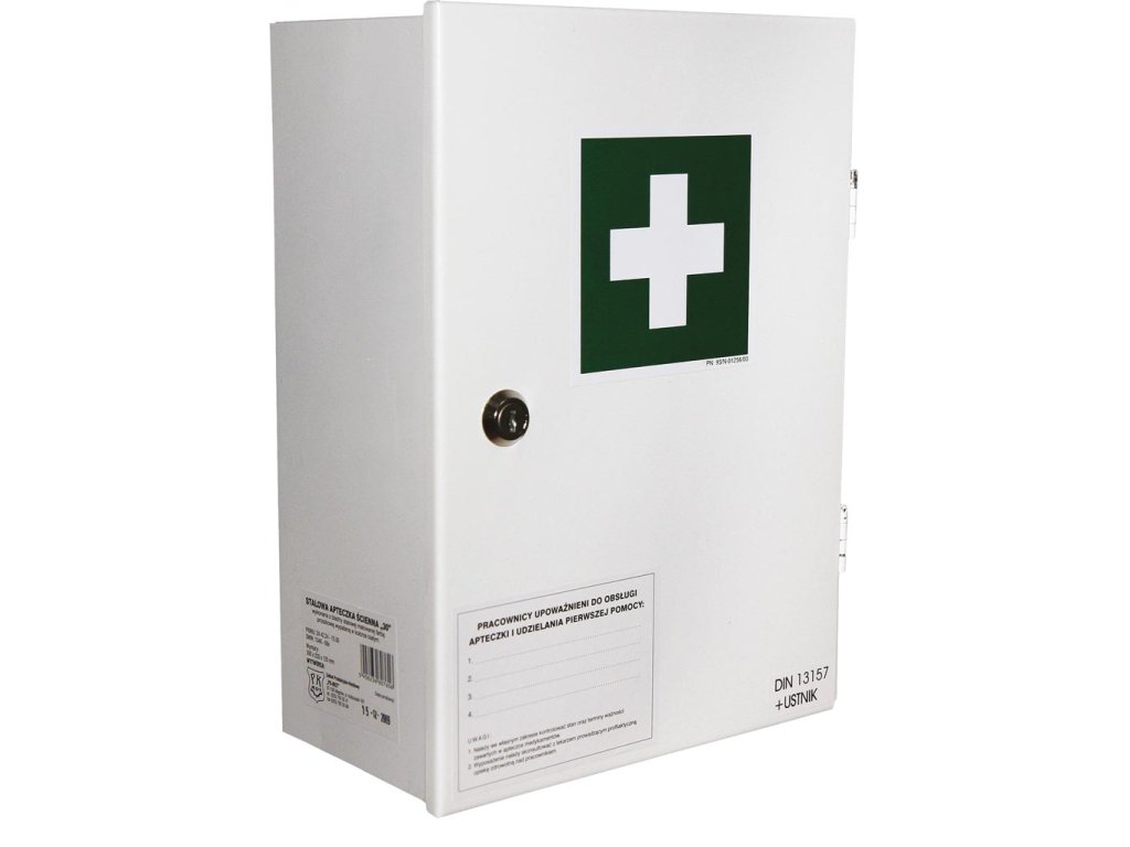 Nástenná lekárnička. - Vyrobené z oceľového plechu s vypáleným bielym práškovým nástrekom - Zariadenie v súlade s normou DIN 13157:2021 - 5m x 2,5cm omietka na cievke (1 ks) - Sada 5 náplastí (42 ks/1 balenie) - Bandáž s obkladom (individuálny obväz) 6x8 cm (1 ks) - Bandáž s obkladom (individuálny obväz) 8x10 cm (3 ks) - Bandáž s obkladom (individuálny obväz) 10x12 cm (1 ks) - Obväzová látka 60x80 cm (1 ks) - Obklad na ranu 10x10 cm (6 ks/3 bal.) - Kompresia na oči 5x7,5 cm (2 ks) - studený obklad (1 ks) - Termálna deka (núdzová) (210x160 cm) (1 ks) - Elastický obväz 4m x 6cm (2 ks.) - Elastický obväz 4m x 8cm (2 ks.) - Trojuholníkový obväz 96x96x136 cm (2 ks.) - nožnice (1 ks) - plastové vrecko (2 ks) - Bandáž z netkanej textílie 20x30 cm (5 ks/1 bal.) - vlhčené obrúsky (4 ks.) - Jednorazové rukavice (4 ks/2 páry) - lekárska maska (2 ks) - Pokyny "Prvá pomoc" (1 ks) - respirátor (1 ks) - Určené pre pracoviská - Rozmery lekárničky: 30x22x12 cmDodatočné parametre