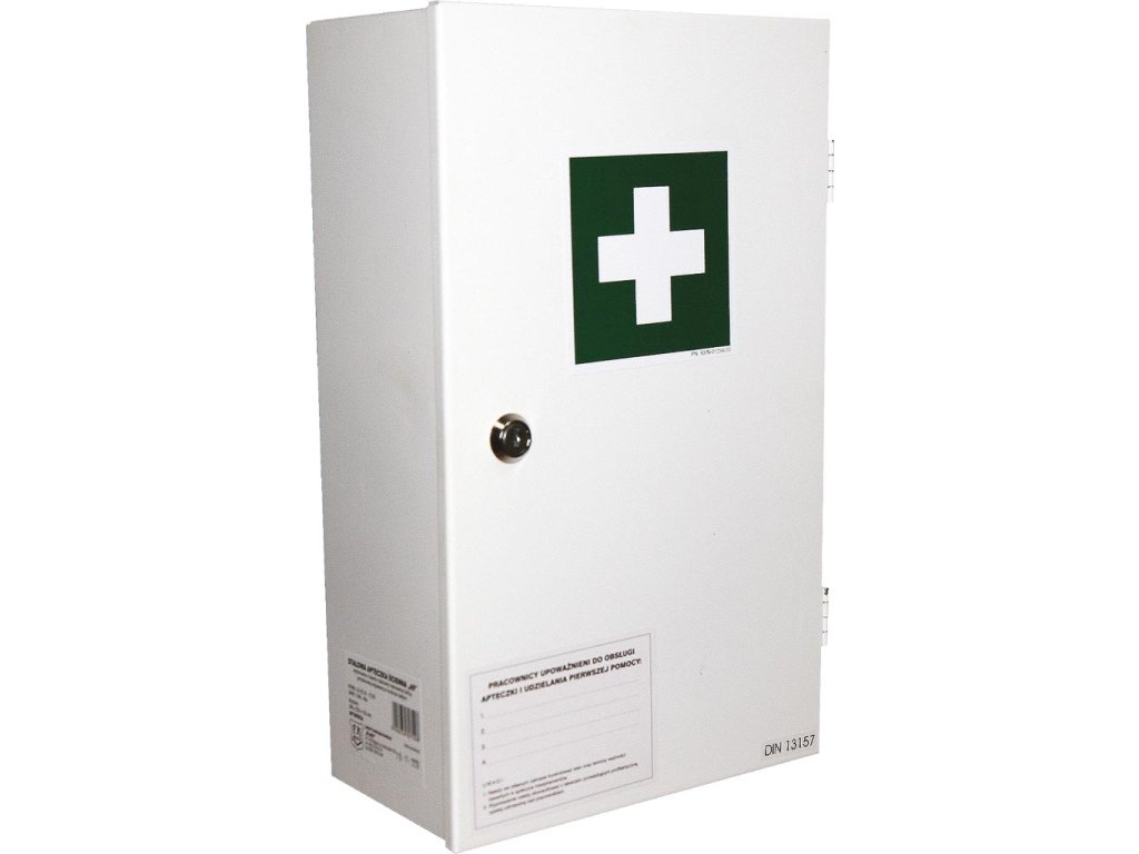 Nástenná lekárnička. - Vyrobené z oceľového plechu s vypáleným bielym práškovým nástrekom - Zariadenie v súlade s normou DIN 13157:2021 - 5m x 2,5cm omietka na cievke (1 ks) - Sada náplastí (5 druhov) (42 ks/1 bal.) - Bandáž s obkladom (individuálny obväz) 6x8 cm (1 ks) - Bandáž s obkladom (individuálny obväz) 8x10 cm (3 ks) - Bandáž s obkladom (individuálny obväz) 10x12 cm (1 ks) - Obväzová látka 60x80 cm (1 ks) - Obklad na ranu 10x10 cm (6 ks/3 balenia) - Kompresia na oči 5x7,5 cm (2 ks) - studený obklad (1 ks) - Termálna deka (núdzová) (210x160 cm) (1 ks) - Elastický obväz 4m x 6cm (2 ks.) - Elastický obväz 4m x 8cm (2 ks.) - Rozmery trojuholníkového obväzu: 96x96x136cm (2 ks.) - nožnice (1 ks) - plastové vrecko (2 ks) - Bandáž z netkanej textílie 20x30 cm (5 ks/1 balenie) - vlhčené obrúsky (4 ks.) - Jednorazové rukavice (4 ks/2 páry) - lekárska maska (2 ks) - Pokyny "Prvá pomoc" (1 ks) - respirátor (1 ks) - Určené pre pracoviská - Rozmery lekárničky: 36x22x12 cmDodatočné parametre