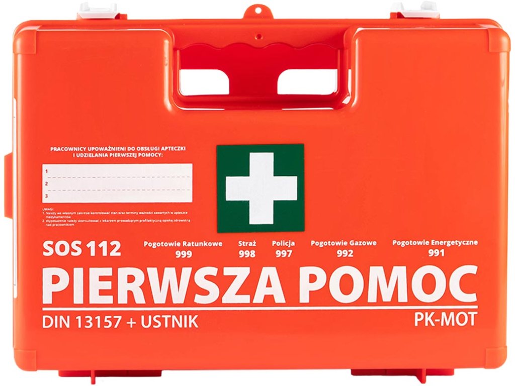 Prenosná súprava prvej pomoci na použitie na mieste. - vyrobené z plastu (ABS) - Zariadenie v súlade s normou DIN 13157:2021 - 5m x 2,5cm omietka na cievke (1 ks) - Sada náplastí (5 druhov) (42 ks/1 bal.) - Bandáž s obkladom (individuálny obväz) 6x8 cm (1 ks) - Bandáž s obkladom (individuálny obväz) 8x10 cm (3 ks) - Bandáž s obkladom (individuálny obväz) 10x12 cm (1 ks) - Obväzová látka 60x80 cm (1 ks) - Obklad na ranu 10x10 cm (6 ks/3 bal.) - Kompresia na oči 5x7,5 cm (2 ks) - studený obklad (1 ks) - Pohotovostná deka (210x160 cm) (1 ks) - elastický obväz 4m x 6cm (2 ks) - elastický obväz 4m x 8cm (2 ks) - Rozmery trojuholníkového obväzu: 96x96x136 cm (2 ks) - nožnice (1 ks) - plastové vrecko (2 ks) - Bandáž z netkanej textílie 20x30 cm (5 ks/1 balenie) - vlhčené obrúsky (4 ks) - Jednorazové rukavice (4 ks/2 páry) - lekárska maska (2 ks) - návod "Prvá pomoc" (1 ks) - respirátor (1 ks) - S vešiakom na stenu - Určené pre pracoviská - Rozmery lekárničky: 28x21x11,5 cmDodatočné parametre
