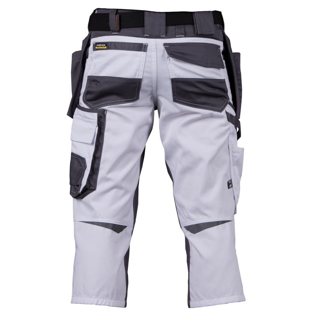Maliarské monterky 3/4 HARVER značky L.HOLLMAN ako stvorene na prácu v horúcich dňoch. - Materiál: 65 % polyester, 35 % bavlna - Hmotnosť: 290 g/m² - Zapínanie na gombík a zips - Štyri bočné vrecká vrátane dvoch všitých vreciek ideálnych na uloženie náradia - Dve zadné vrecká, vrátane jedného so zapínaním na suchý zips - Vrecká na nohaviciach vrátane vrecka na mobilný telefón - Klip na kľúče - Vrecká na kolenné chrániče so zapínaním na suchý zips - Reflexné prvky pre lepšiu viditeľnosť - Testované na škodlivé látky v súlade s normou OEKO-TEX® 100