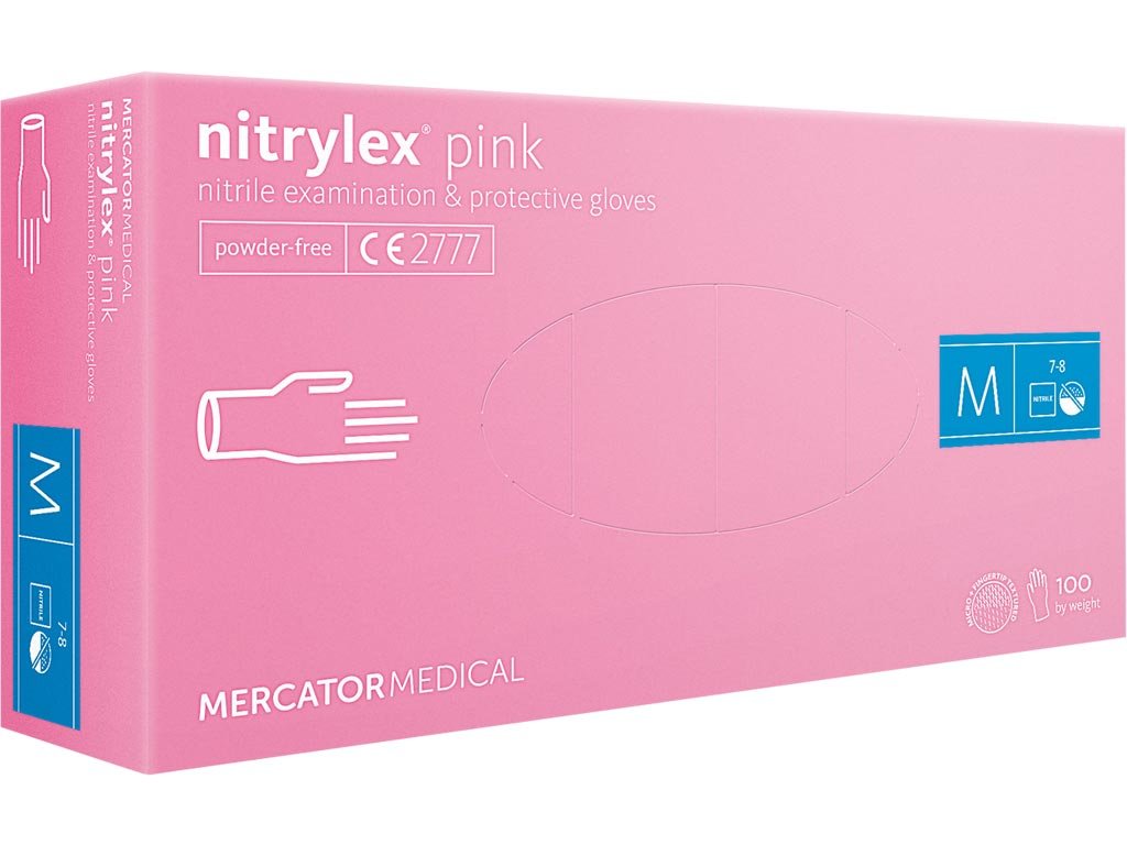 Rukavice Nitrylex® z ružového nitrilu bez púdru. - Vhodné pre obe ruky - Ideálne pre komplexnú manipuláciu - Mikrotextúrovaný exteriér s textúrovanými končekmi prstov - Polymerizované a chlórované vnútro - Vhodné pre použitie v kozmetických salónoch, kaderníckych salónoch, pri domácich prácach, spracovaní mäsa, ovocia a zeleniny a v lekárskom a zubárskom prostredí - Schválené pre styk s potravinami - Zdravotnícka pomôcka I. triedy a osobné ochranné prostriedky III - Balené po 100 kusoch - Vyhovuje normám EN455, EN374-2.4, EN ISO374-5, EN ISO 374-1, EN16523-1, EN ISO 15223-1 a EN420Dodatočné parametre