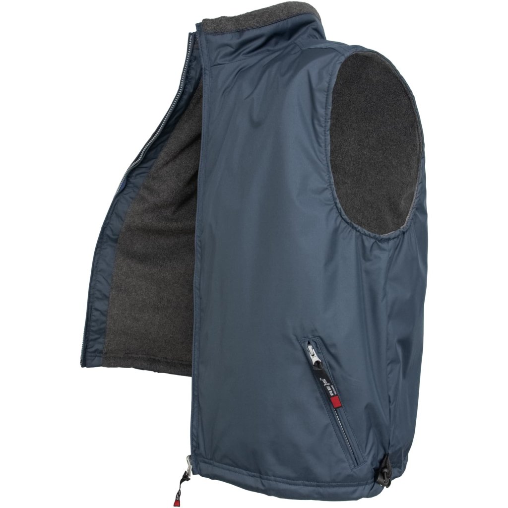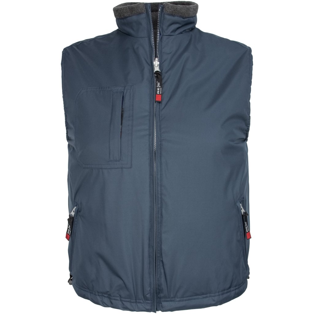 Obojstranná zateplená pracovná vesta REIS. - materiál: 100% polyester s PVC povlakom - flísová podšívka: 100% polyester, 260 g/m2 - zapínanie na zips - tri vrecká na zips zvonku: dve bočné a jedno horné - dve vrecká na zips vo vnútri - elastická šnúrka v spodnej časti - špecifický spôsob šitia umožňuje nosenie na oboch stranách, s flísom zvonku aj zvnútra