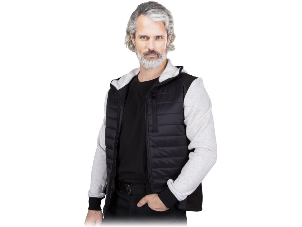 Pánska prešívaná ochranná bunda. - Hlavný materiál: 100% 380T nylon, 35 g/m² - Výplň: 100% polyester, 200 g/m² - Podšívka: 100% polyester 210T taft, 60 g/m² - Čierne vsadky: 96 % polyester, 4 % elastan, 130 g/m² - Svetlosivé vložky: 62 % bavlna, 38 % polyester, 290 g/m² - Zapínanie na zips - Kapucňa s elastickým lemom - Dve spodné vrecká a jedno náprsné vrecko na zips - Rebrované manžetyDodatočné parametre