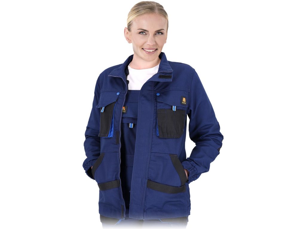 Dámska ochranná bunda FIO. - Hlavný materiál: 80% polyester, 20% bavlnené plátno, 260 g/m² - Vložky: 100% polyester 600D Oxford tkanina, 200 g/m² - Zapínanie na zips s dodatočným suchým zipsom - Stojací golier - Dve dvojité spodné vrecká a dve dvojité náprsné vrecká so zapínaním na suchý zips - Výstuhy lakťov - Rebrované manžetyDodatočné parametre