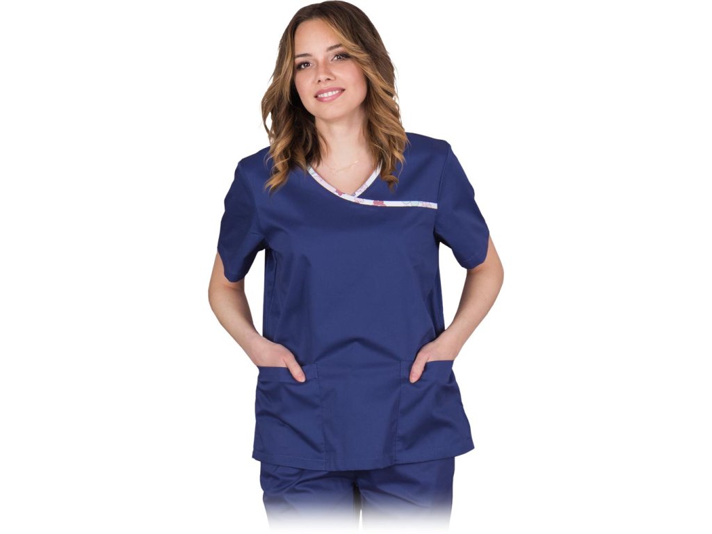 Dámska ochranná mikina SENZA s krátkym rukávom. - Materiál: 52% bavlna, 45% polyester, 3% elastan - Gramáž: 150 g/m² - Dve bočné vrecká - Bez gombíkov - Naťahuje sa cez hlavu - Výstrih do V s ozdobným lemovaním - Ideálne pre kozmetický, medicínsky a chemický priemysel - Vhodné pre laboratórne práce - Možno prať do 40°CDodatočné parametre