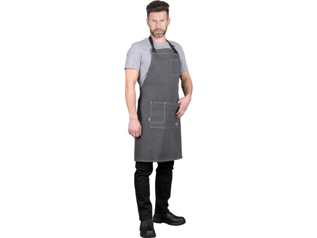 Ochranná zástera. - Džínsovina: 19% polyester, 79% bavlna, 2% elastan - Gramáž: 340 g/m² - Nosí sa okolo krku - Zaväzovanie vzadu na dva popruhy pre lepšie uchytenie - Veľkosť: 86x86 cm má tri vrecká: dve v strede dole a jedno hore - Veľkosť: 90x105 cm má tri vrecká: dve na boku dole a jedno hore - Odnímateľné popruhy vďaka patentkám - Možno prať v práčke do 30°CDodatočné parametre