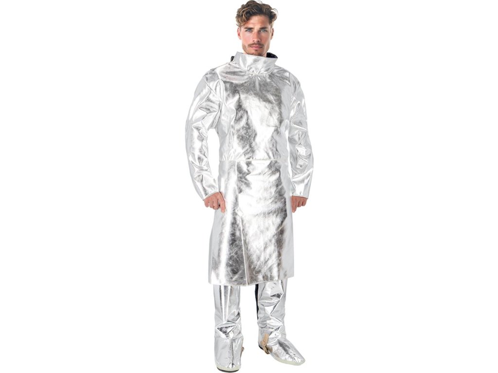 Ohňovzdorná ochranná zástera. - Ochrana hornej časti trupu z metalizovanej látky para-aramid/Preox. - Spodná ochrana trupu vyrobená z metalizovanej sklenenej tkaniny a bavlnená podšívka spomaľujúca horenie. - Stojací golier, vpredu dlhší. - Zapínanie na suchý zips vzadu, na krku a bokoch. - Chráni prednú a bočnú časť trupu a čiastočne aj nohy. - Vetracie otvory pod pažami. - Chráni pred plameňmi, postriekaním roztaveným kovom a intenzívnym tepelným žiarením. - Navrhnuté na použitie v spojení s odevom alebo iným ochranným odevom pri práci zahŕňajúcej spúšťanie a liatie ocele a neželezných kovov. - Odporúča sa okrem iného pre: zlievareň kovov, kaliareň, valcovňa, huta - v súlade s EN ISO 13688 a EN ISO 11612 (A1 B1 C3 D3 E3 F1)Dodatočné parametre