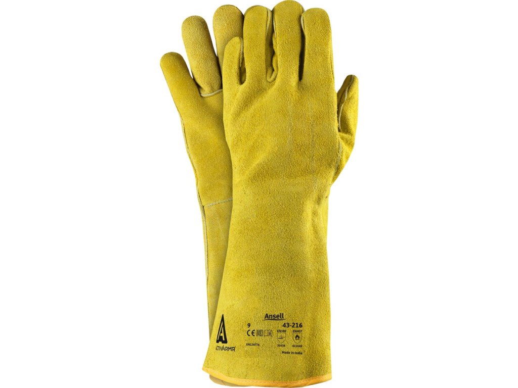 Ochranné kožené rukavice WorkGuard Ansell 43-216. - vyrobené z štiepanej hovädzej kože - celokožené, t. j. vyrobené výlučne z kože - švy vyrobené z kevlarových vlákien a vystužené kúskami surovej hovädzej kože poskytujú vynikajúcu mechanickú ochranu - rukavice sú vhodné pre širokú škálu aplikácií vyžadujúcich odolnosť voči vysokým teplotám, ako je zváranie, obsluha strojov a práca v prostrediach, kde sú riziká spojené s vysokými teplotami alebo striekaním horúcich kvapalín - zaisťujú pohodlie pri nosení vďaka mäkkej vnútornej podšívke z džerseja - používajú sa na zváranie a nakladanie a vykladanie v prostrediach, kde je riziko vysokých teplôt, striekania roztaveného kovu a riziko iskier - odolné voči kontaktnému teplu do 100 °C
