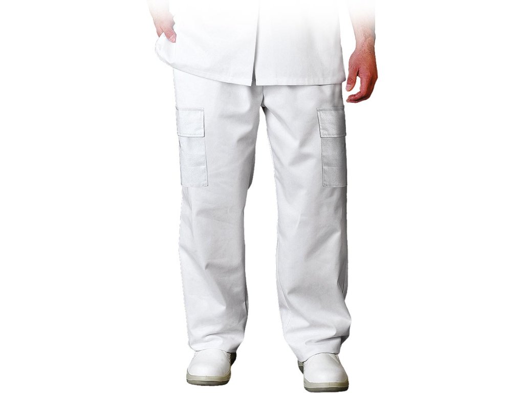 Pánske ochranné nohavice do pása. - Materiál: 65% polyester, 35% bavlna - Gramáž: 250 g/m² - Zapínanie na gombík - Elastický pás pre lepšie prispôsobenie - Dve vrecká na nohavici so zapínaním na suchý zips a jedno zadné vrecko - Určené pre laboratórne práce - Ideálne pre kozmetický, medicínsky a chemický priemysel - Vhodné na priemyselné pranie (maximálna teplota: 95°C)Dodatočné parametre