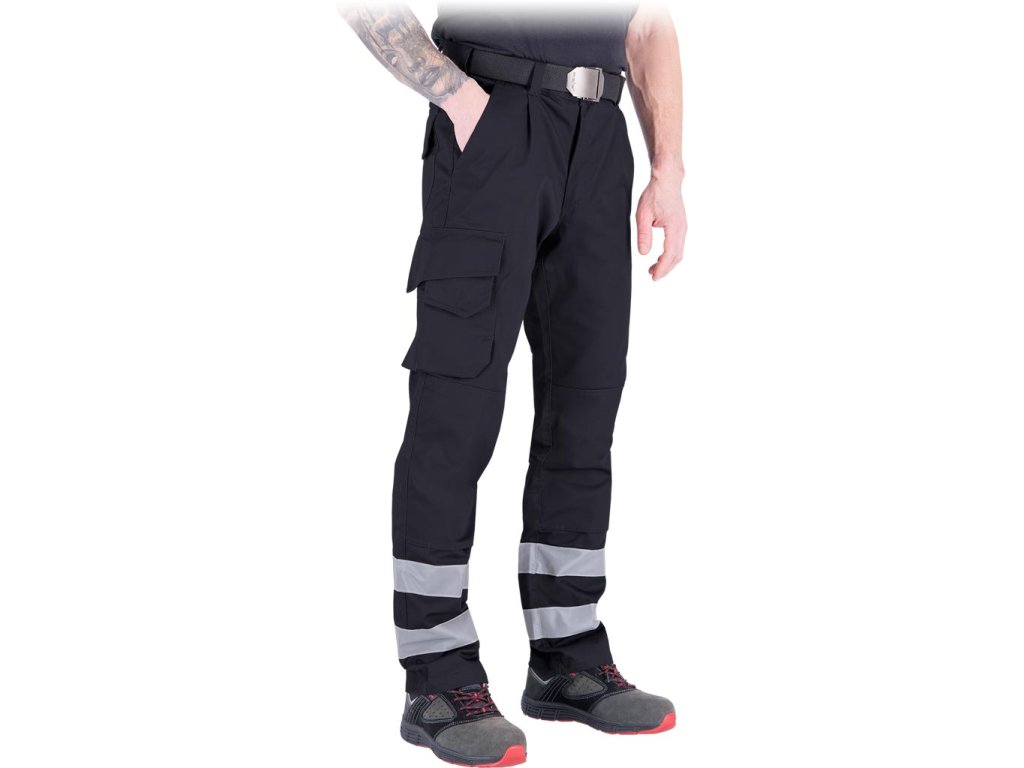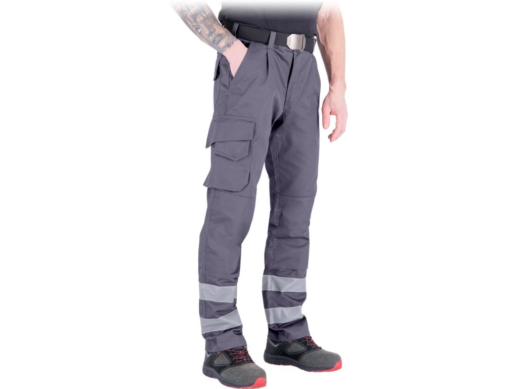 Pánske ochranné nohavice do pása. - keprová tkanina: 65% polyester, 35% bavlna - hmotnosť: 270 g/m² - zapínanie na gombík a zips - dve bočné vrecká a dve zadné vrecká so zapínaním na patentky - tri vrecká na nohách, vrátane jedného dlhého vrecka s priehradkami - spodné plnené vrecká na chrániče kolien - klip na kľúče - reflexné pruhy pre zvýšenú viditeľnosť - strih: REGULARDodatočné parametre