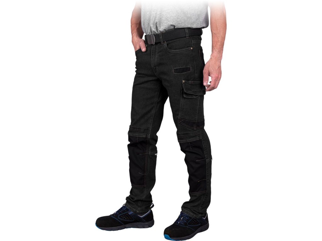 Pánske elastické ochranné nohavice do pása. - Denim látka: 78% bavlna, 20% polyester, 2% elastan - Hmotnosť: 210-220 g/m² - Zapínanie na gombík a zips - Dve bočné vrecká - Dve zadné vrecká, vrátane jedného so skrytou chlopňou - Vrecká na nohách, vrátane vrecka na mobil - Klip na kľúče - Držiak náradia - Vrecká na chrániče kolien - Reflexné prvky pod kolenami - Cordura vložky pre zvýšenú odolnosť - Elastan umožňuje lepšie prispôsobenie a zároveň umožňuje neobmedzený pohybDodatočné parametre