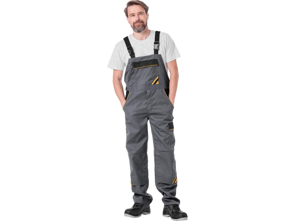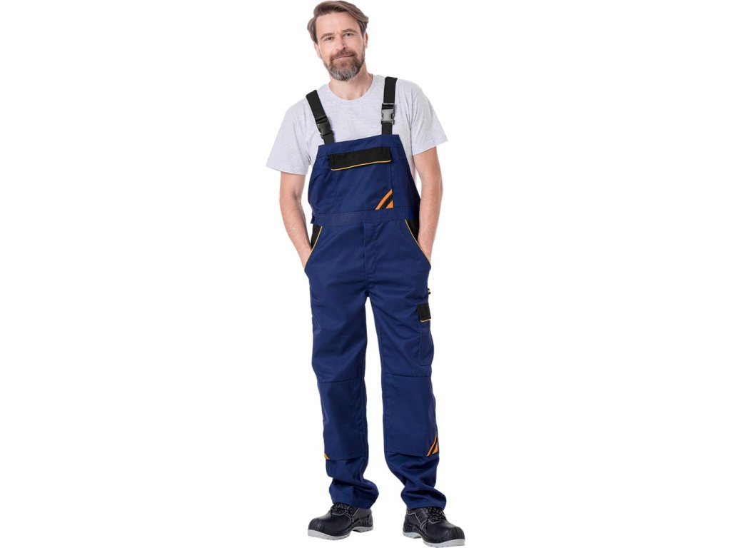 Pánske ochranné montérky. - Materiál: 65% polyester, 35% bavlna - Gramáž: 300 g/m² - Žlté a oranžové vložky vyrobené z 80% polyesteru, 20% bavlny - Náprsné vrecko so zapínaním na suchý zips - Dve bočné vrecká - Dve zadné vrecká so zapínaním na suchý zips - Štyri vrecká na nohách, vrátane dvoch so zapínaním na suchý zips - Elastický pás vzadu pre väčšiu voľnosť pohybu a lepšie prispôsobenie - Nastaviteľný pás pomocou gombíkov a trakov - Vrecká na podkolienky na kolenách - Klip na kľúčeDodatočné parametre