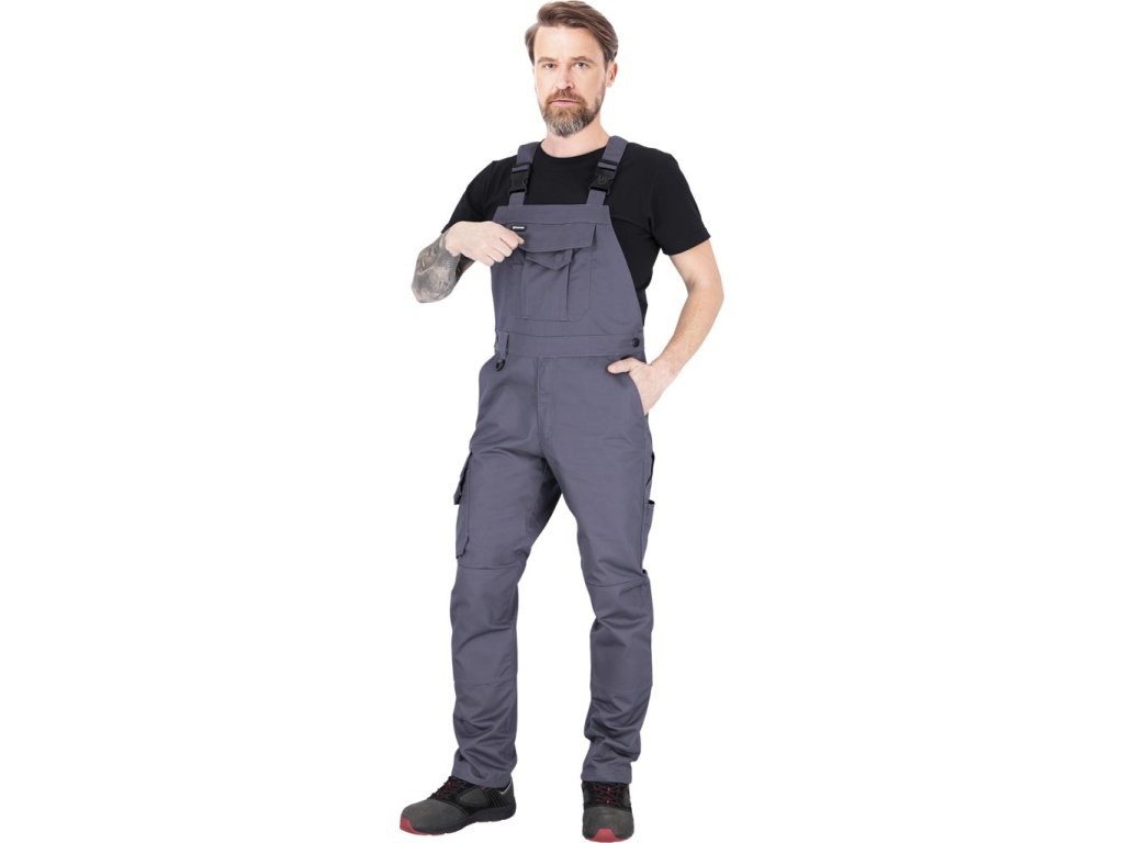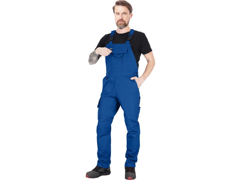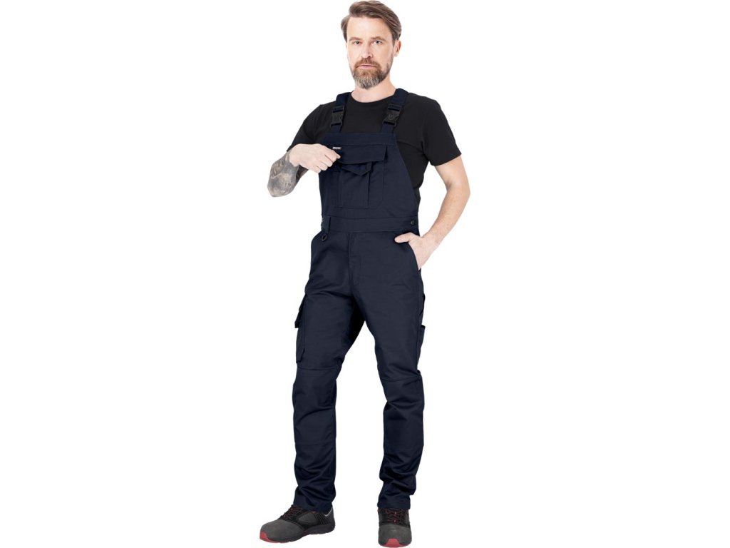 Pánske ochranné montérky. - Materiál: 65% polyester, 35% bavlna - Gramáž: 270 g/m² - Zapínanie na zips s chlopňou - Dvojité náprsné vrecko so zapínaním na cvok a dodatočnou priehradkou - Dve bočné vrecká a dve zadné vrecká so zapínaním na cvok - Tri vrecká na nohách, vrátane jedného dlhého vrecka s priehradkami - Vrecká na chrániče kolien so spodným vstupom - Nastaviteľná dĺžka trakmi, ktoré majú vzadu aj gumu - Gombíky v páse pre lepšie prispôsobenie - Klip na kľúče - Fit: REGULARDodatočné parametre