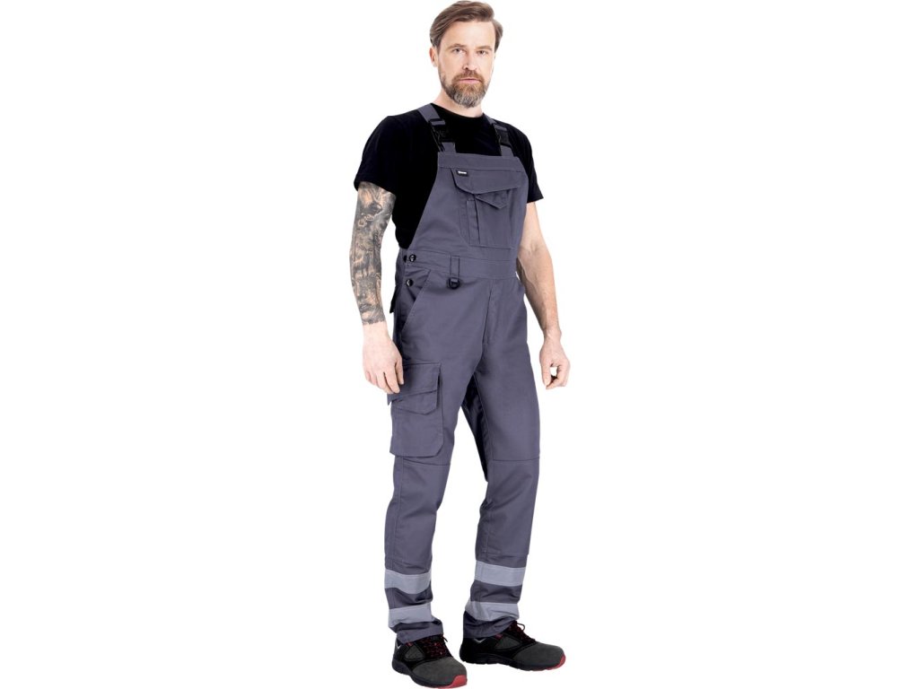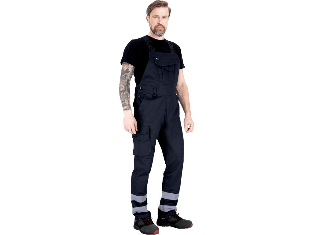 Pánske ochranné montérky. - Materiál: 65% polyester, 35% bavlna - Gramáž: 270 g/m² - Zapínanie na zips s chlopňou - Dvojité náprsné vrecko so zapínaním na cvok a dodatočnou priehradkou - Dve bočné vrecká a dve zadné vrecká so zapínaním na cvok - Tri vrecká na nohách, vrátane jedného dlhého vrecka s priehradkami - Vrecká na chrániče kolien so spodným vstupom - Dĺžka nastaviteľná trakmi, ktoré majú aj elastickú zadnú časť - Gombíky v páse pre lepšie prispôsobenie - Klip na kľúče - Reflexné pásiky pre zvýšenú viditeľnosť - Fit: REGULARDodatočné parametre