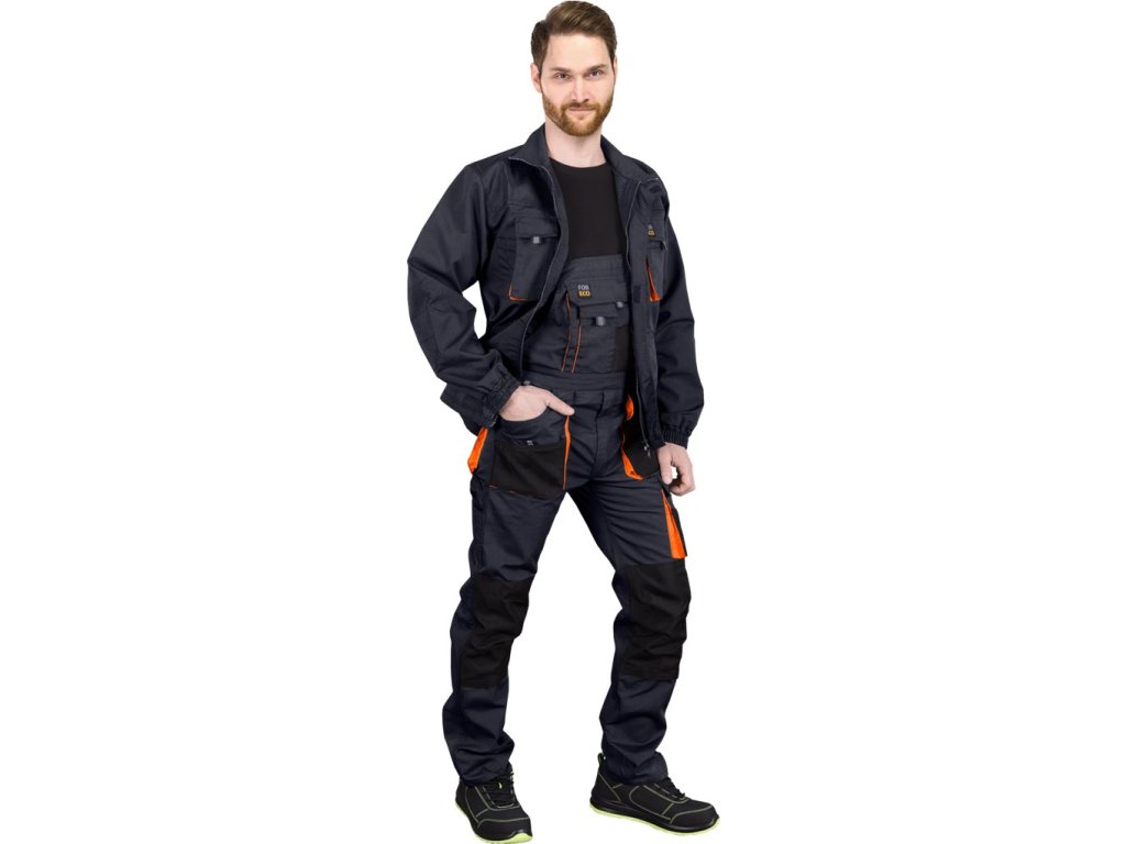 Pánske ochranné montérky. - Hlavný materiál: 80% polyester, 20% bavlna, 260 g/m² - Vložky: 100% polyester 600D Oxford tkanina, 200 g/m² - Zapínanie na zips s chlopňou - Dvojité náprsné vrecko s ďalšími priehradkami - Dve dvojité bočné vrecká s priehradkami a dve zadné vrecká so zapínaním na suchý zips - Dve dvojité vrecká na nohách, vrátane jedného na náradie - Vrecká na nákolenníky so zapínaním na suchý zips, vložené zospodu - Dĺžka nastaviteľná trakmi, ktoré majú vzadu aj gumičku - Elastický pás vzadu a gombíky pre lepšie prispôsobenie - Klip na kľúče - Slučka na kladivo na ľavej nohe - Reflexné prvky Prvky zlepšujúce viditeľnosť - Pravidelný strih - Testované na škodlivé látky v súlade s OEKO-TEX® Standard 100Dodatočné parametre
