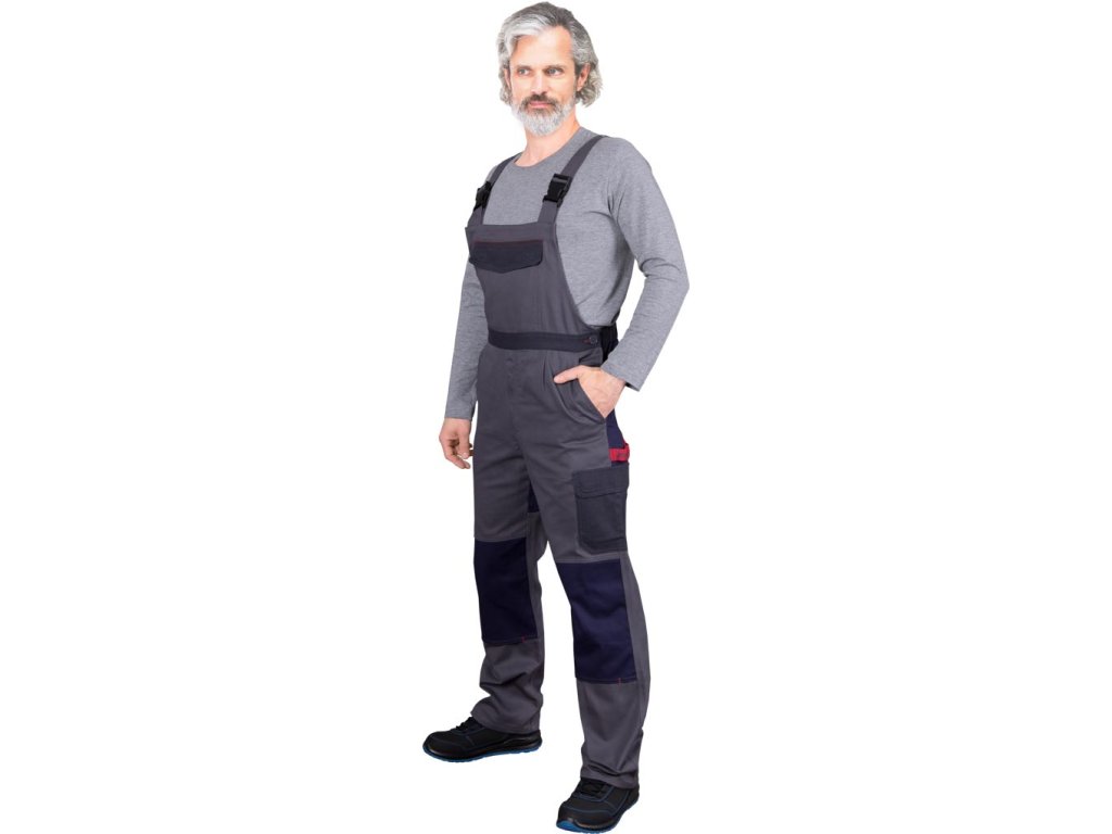 Ochranné montérky BOMER. - Materiál: 100% bavlna, 260 g/m² - Vložky vyrobené z námorníckej modrej 62 % polyester, 34 % bavlna, 4 % elastan, 240 g/m² - Náprsné vrecko so zapínaním na suchý zips - Dve bočné a dve zadné vrecká - Tri vrecká na nohách, vrátane jedného so zapínaním na suchý zips - Elastický pás na bokoch pre väčšiu voľnosť pohybu a lepšie prispôsobenie - Nastaviteľný pás s ďalšími gombíkmi a trakmi, ktoré majú vzadu aj gumu - Vrecká na podkolienky na kolenách - Slučka na kladivo na ľavej nohe - Vďaka použitiu spandexu nohavice lepšie priliehajú k telu bez obmedzovania pohybu - Ideálne na horúce dniDodatočné parametre