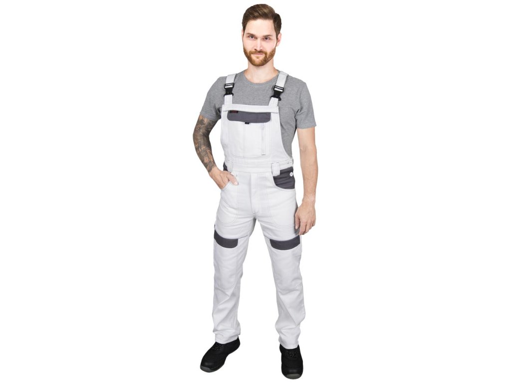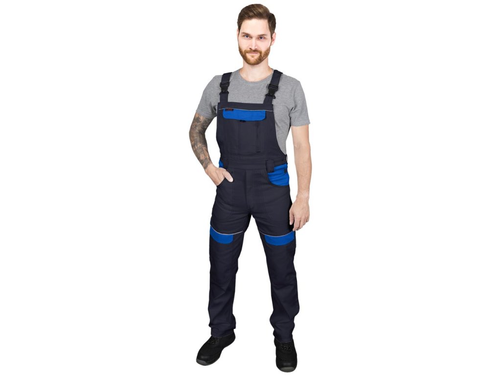 Pánske ochranné montérky CORTON. - Látka: 100% bavlna - Gramáž: 260 g/m² - Dvojité náprsné vrecko - Dve bočné vrecká a dve zadné vrecká so zapínaním na suchý zips - Vrecká na nohách, vrátane jedného na náradie - Šnúrka v páse a gombíky pre väčšiu voľnosť pohybu a lepšie prispôsobenie - Nastaviteľná dĺžka trakmi, ktoré majú aj elastický chrbát - Reflexné prvky - Fit: REGULARDodatočné parametre