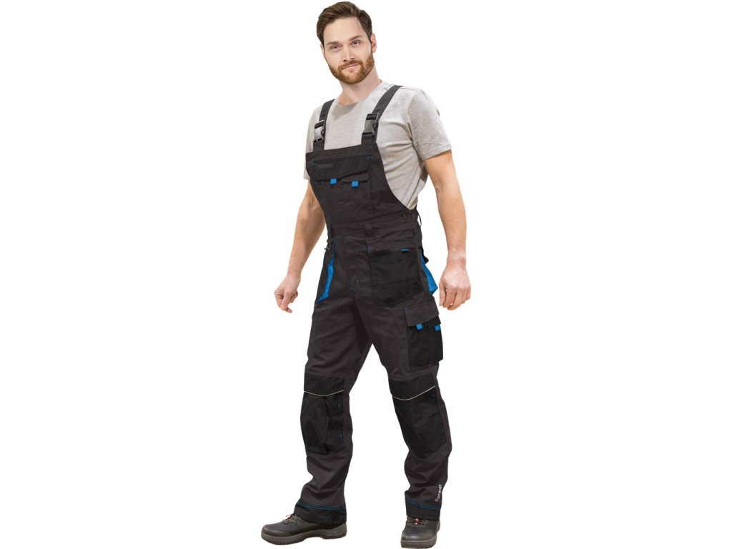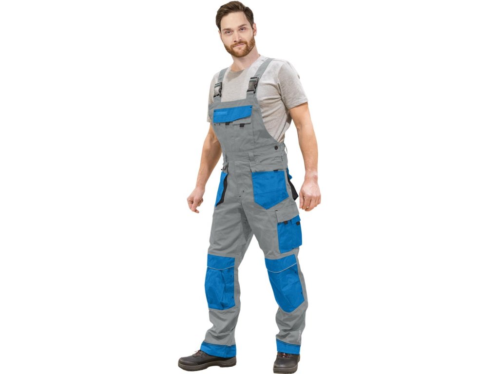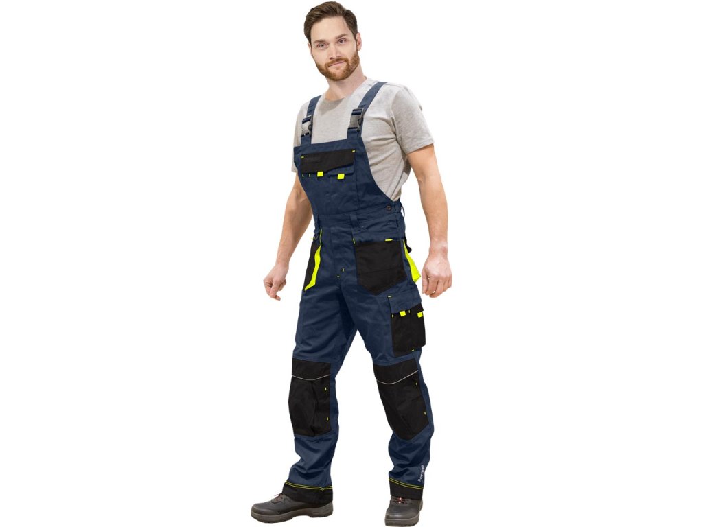 Pánske ochranné montérky FORMEN. - Hlavný materiál: 65% polyester, 35% bavlnené plátno, 270g/m² - Vložky: 100 % polyester 600D Oxford tkanina, 240 g/m², a 100 % nylon 500D Cordura látkové prvky, 200 g/m² - Zapínanie na zips s chlopňou - Náprsné vrecko so zapínaním na suchý zips, vrecko na mobilný telefón a ďalšie priehradky - Dve dvojité bočné vrecká a dve zadné vrecká so zapínaním na suchý zips - Vrecká na nohách, vrátane jedného so zapínaním na suchý zips a ďalších vreciek na príslušenstvo a jedného pozdĺžneho vrecka s priehradkami - Zhora plnené vrecká na chrániče kolien so zapínaním na suchý zips - Predtvarované kolená - Nastaviteľná dĺžka pomocou podväzkov, ktoré majú vzadu aj gumičku. - Elastický pás vzadu a gombíky pre lepšie prispôsobenie. - Klip na kľúče. - Slučka na kladivo na pravej nohe. - Reflexné prvky. - Fit: REGULAR. - Testované na škodlivé látky v súlade s OEKO-TEX® Standard 100.Dodatočné parametre