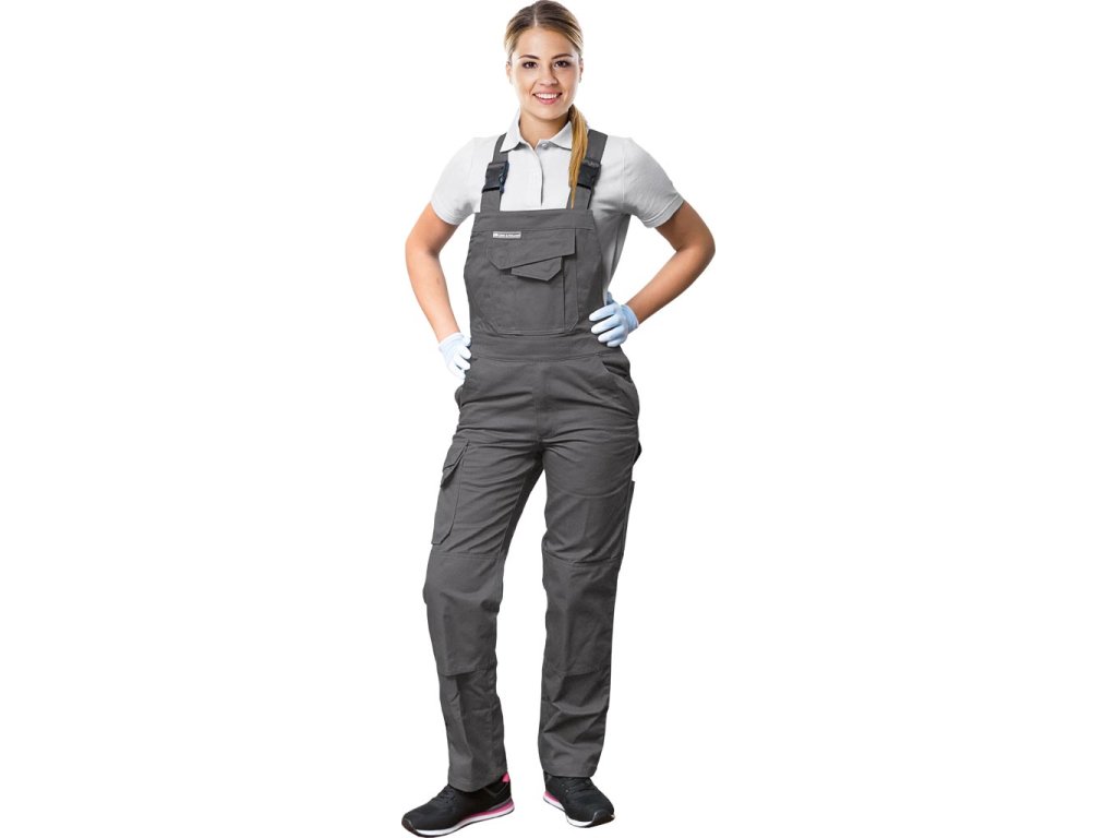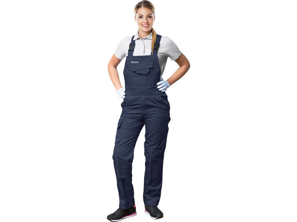 Dámske ochranné montérky. - 65% polyester, 35% bavlna - hmotnosť 270 g/m² - Technológia HTF pre trvanlivosť a odolnosť proti oderu - Zvýšená odolnosť voči mastnote, olejom a nečistotám - Vrecká na chrániče kolien - Šesť vreciek: dve vzadu so zapínaním na patentky, dve na bokoch a jedno na nohách (jedno na mobilný telefón a jedno na zips) - Jedno vrecko na gombík v hornej časti nohavíc - Klip na kľúče - Nastaviteľný pás, nastaviteľná dĺžka pomocou trakov, s dodatočnou gumou vzaduDodatočné parametre