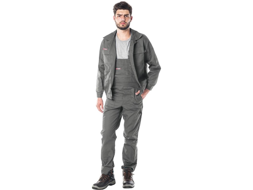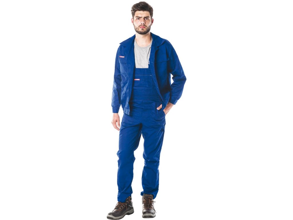 Majstrovský ochranný odev pozostávajúci z mikiny a montérok. - Materiál: 65% polyester, 35% bavlna - Hmotnosť: 262 g/m² - Mikina: zapínanie na gombíky, dve predné vrecká so zapínaním na suchý zips, manžety na gombíky. Elastická guma v spodnej časti mikiny zaisťuje priliehavý strih a chráni pred vetrom. - Dungarees: v páse nastaviteľné pomocou prídavných gombíkov a na dĺžku pomocou trakov, ktoré majú tiež gumičku vzadu, dve bočné vrecká a jedno na nohavici. Dve ďalšie vrecká v hornej časti nohavíc, jedno na zips.Dodatočné parametre