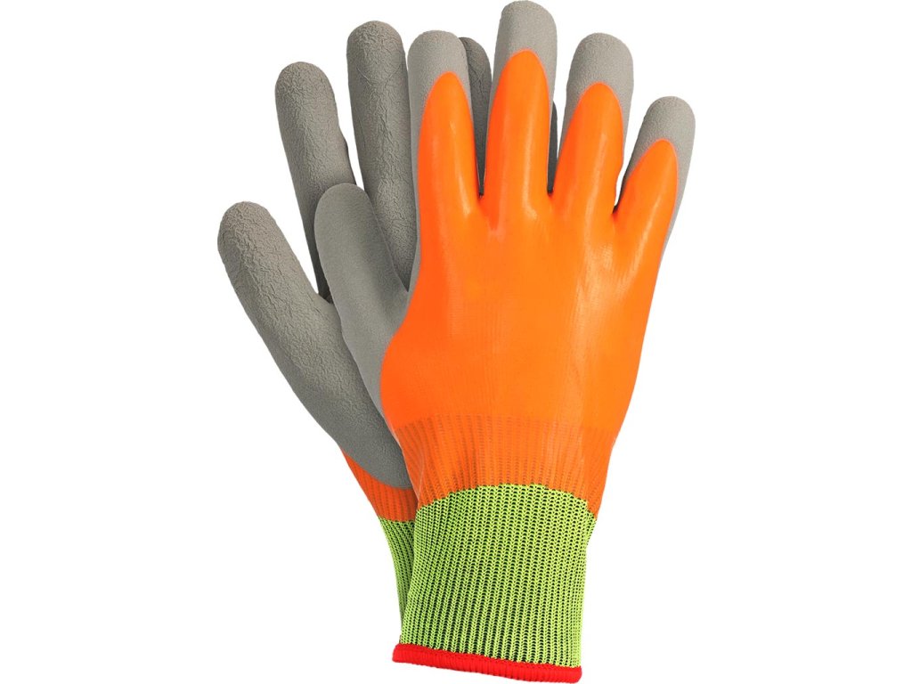 Izolované ochranné rukavice. - Dvojvrstvový úplet: 100 % polyester (rozmer 13) zvonka, 100 % slučkový polyester (rozmer 7) zvnútra - Vrchná vrstva je potiahnutá fluorescenčným oranžovým hladkým latexom - Rukoväť potiahnutá FOAM latexom - Rebrované manžety - Používa sa v stavebníctve a dopravnom priemysleDodatočné parametre