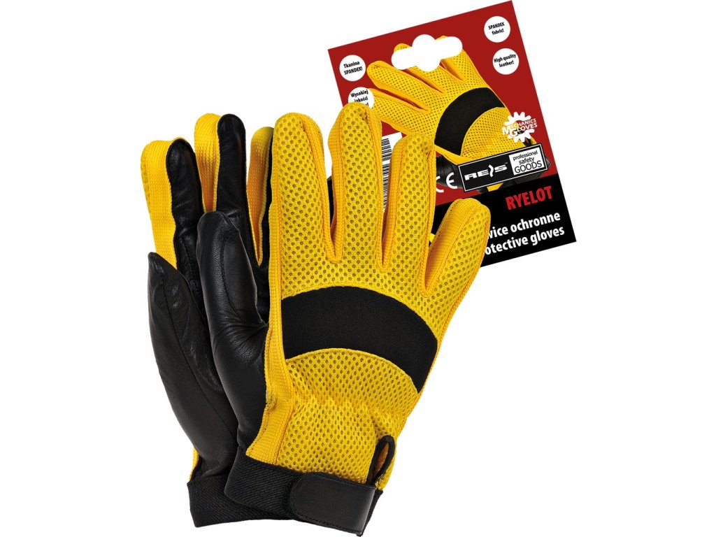 Ochranné rukavice vyrobené z kvalitnej mäkkej kozej kože v kombinácii s látkou.- Chrbát rukavice je vyrobený zo žltej sieťoviny